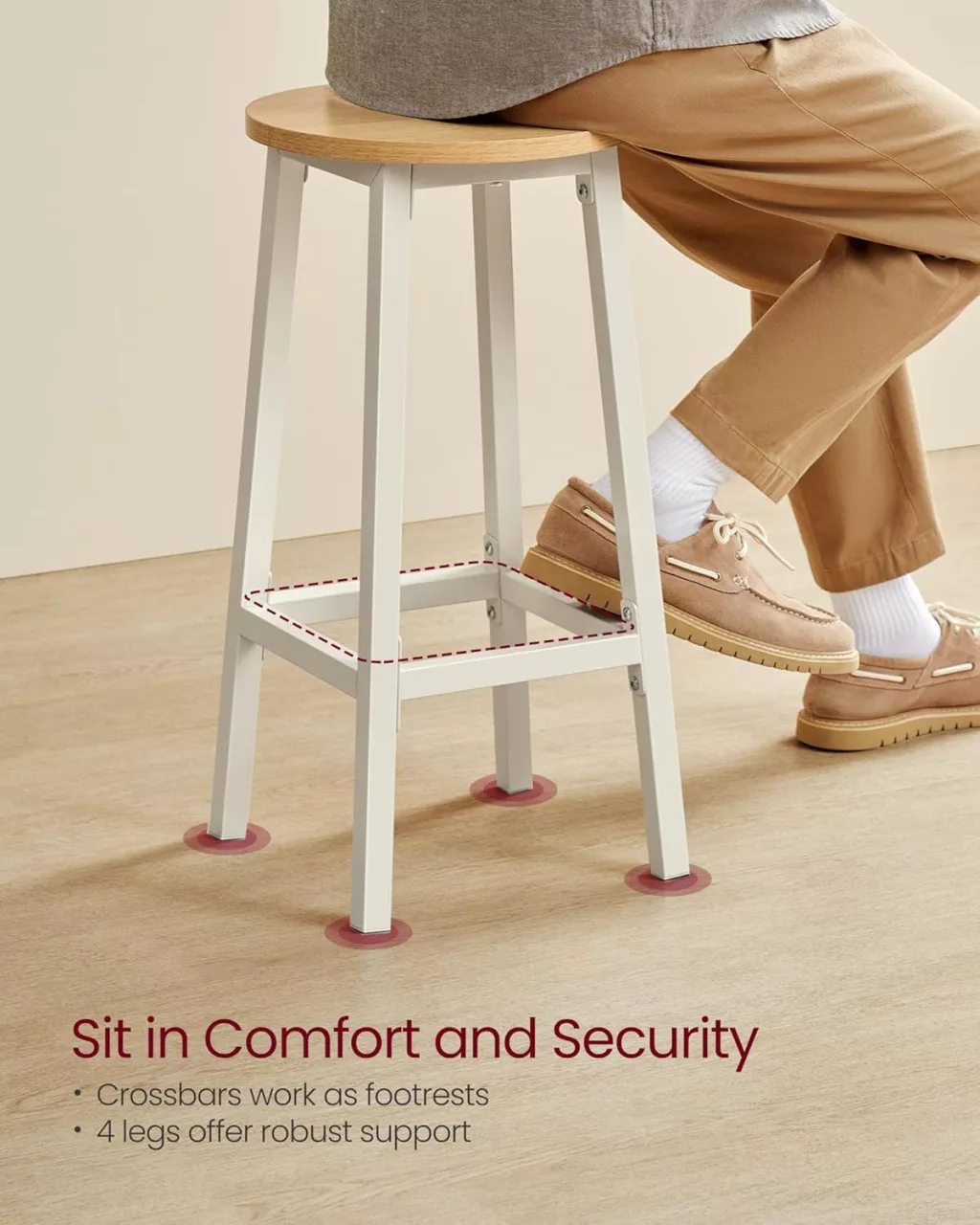 A VASAGLE bárszék szett tökéletes választás azok számára, akik a funkcionalitást és az időtlen designt egyaránt értékelik. A természetes tölgy hatású ülőlap és a fehér fém váz harmonikus kontrasztja bármilyen berendezési stílushoz illeszkedik, legyen szó modern konyhapultról vagy klasszikus bárasztalról. A kompakt, 32 cm átmérőjű kerek ülőfelület kényelmes ülőhelyet biztosít, míg a 65 cm-es magasság ideális a standard bárpultokhoz.