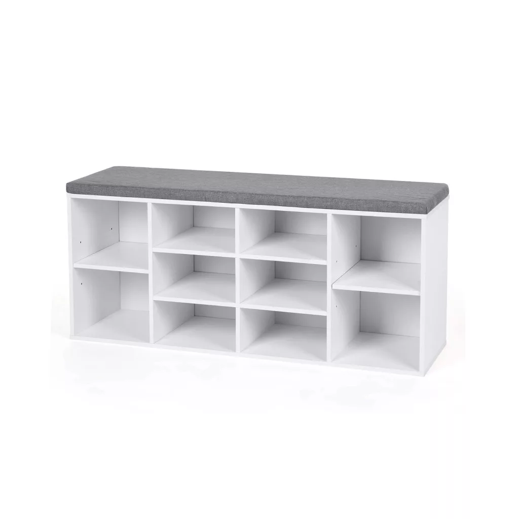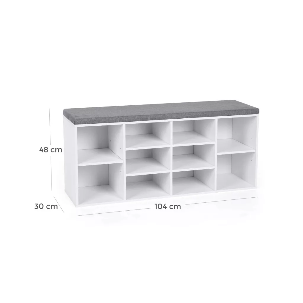 VASAGLE cipős pad 10 rekeszes tárolóval párnázott ülőfelülettel fehér 104 x 30 x 48 cm