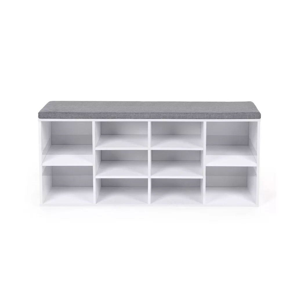 Stílusos és praktikus cipős pad párnázott ülőfelülettel, amely 10 tágas rekeszt kínál cipőid rendezett tárolásához. A fehér színű bútor tökéletes kiegészítője előszobádnak, miközben kényelmes ülőhelyet biztosít a cipőfelvételhez.