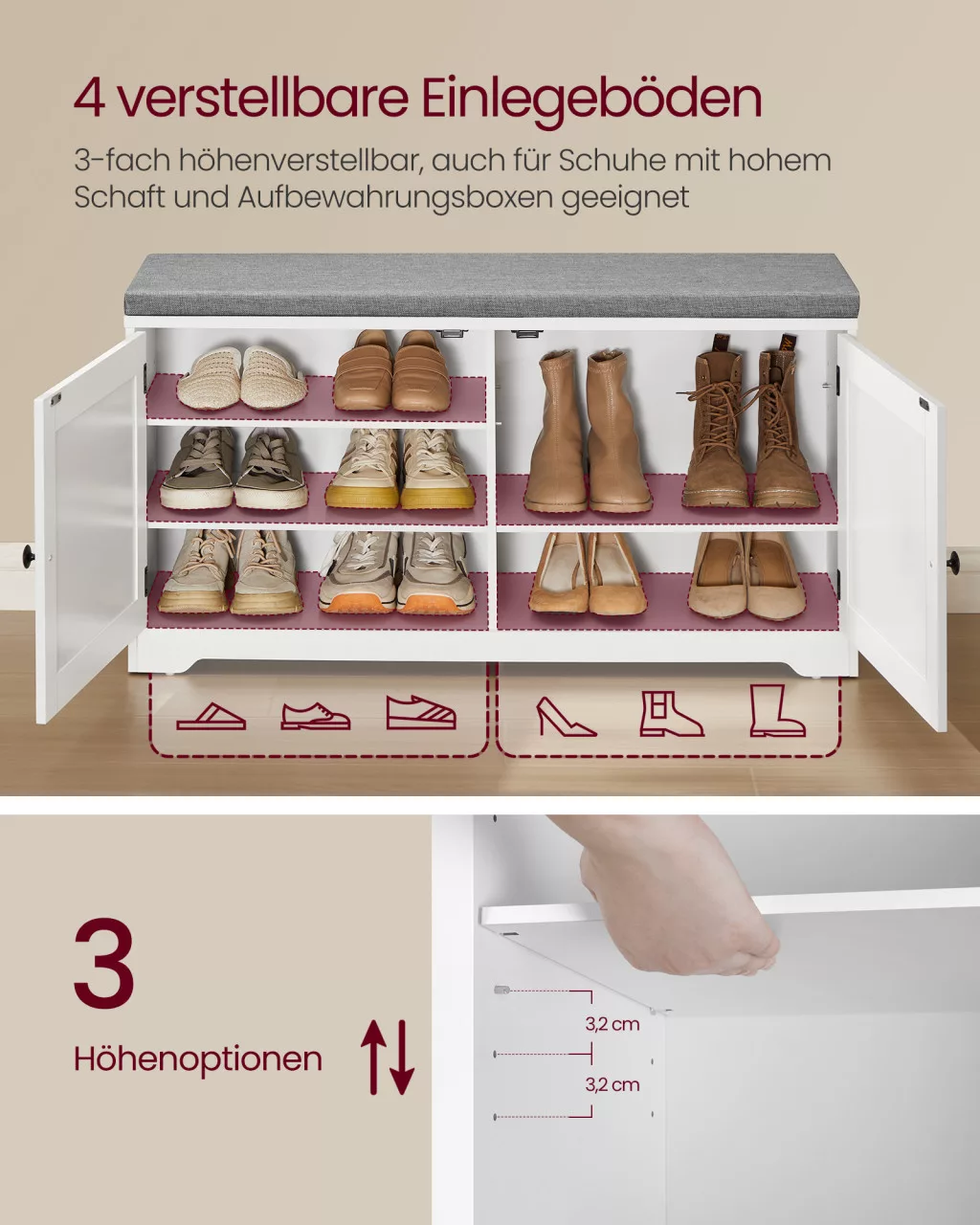 • Állítható polcrendszer: a cipőszekrény 2 állítható polca lehetővé teszi a tér optimális kihasználását különböző magasságú cipők tárolására