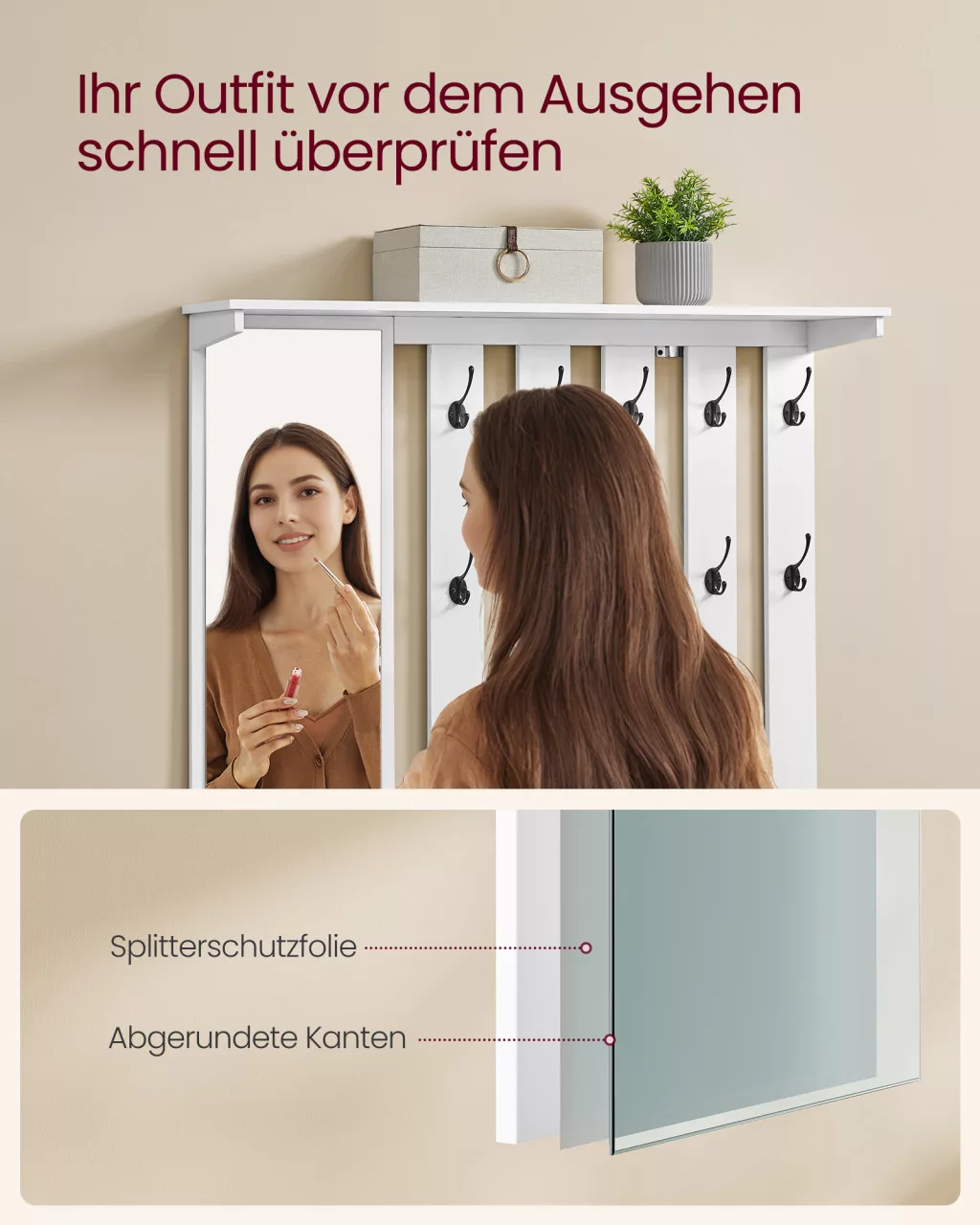 • Nagy méretű tükör (85 x 26 cm): Távozás előtt gyorsan ellenőrizheti megjelenését, így mindig tökéletes öltözetben indulhat útnak