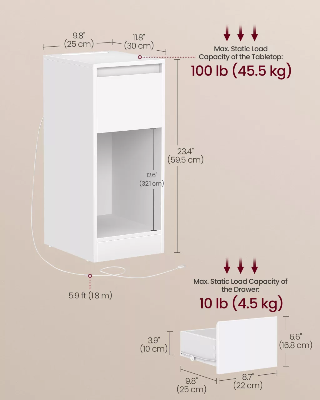 A strapabíró forgácslap és MDF konstrukció akár 45,4 kg-ot is elbír a felső lapon, míg a fiók 4,5 kg teherbírású. A beépített USB-A és USB-C portok lehetővé teszik eszközei kényelmes töltését. Az összeszerelés gyerekjáték a világosan címkézett alkatrészoknak és részletes útmutatónak köszönhetően – állítsa össze éjjeliszekrényét pillanatok alatt, és élvezze a stílus, funkcionalitás és modern kényelem tökéletes ötvözetét.