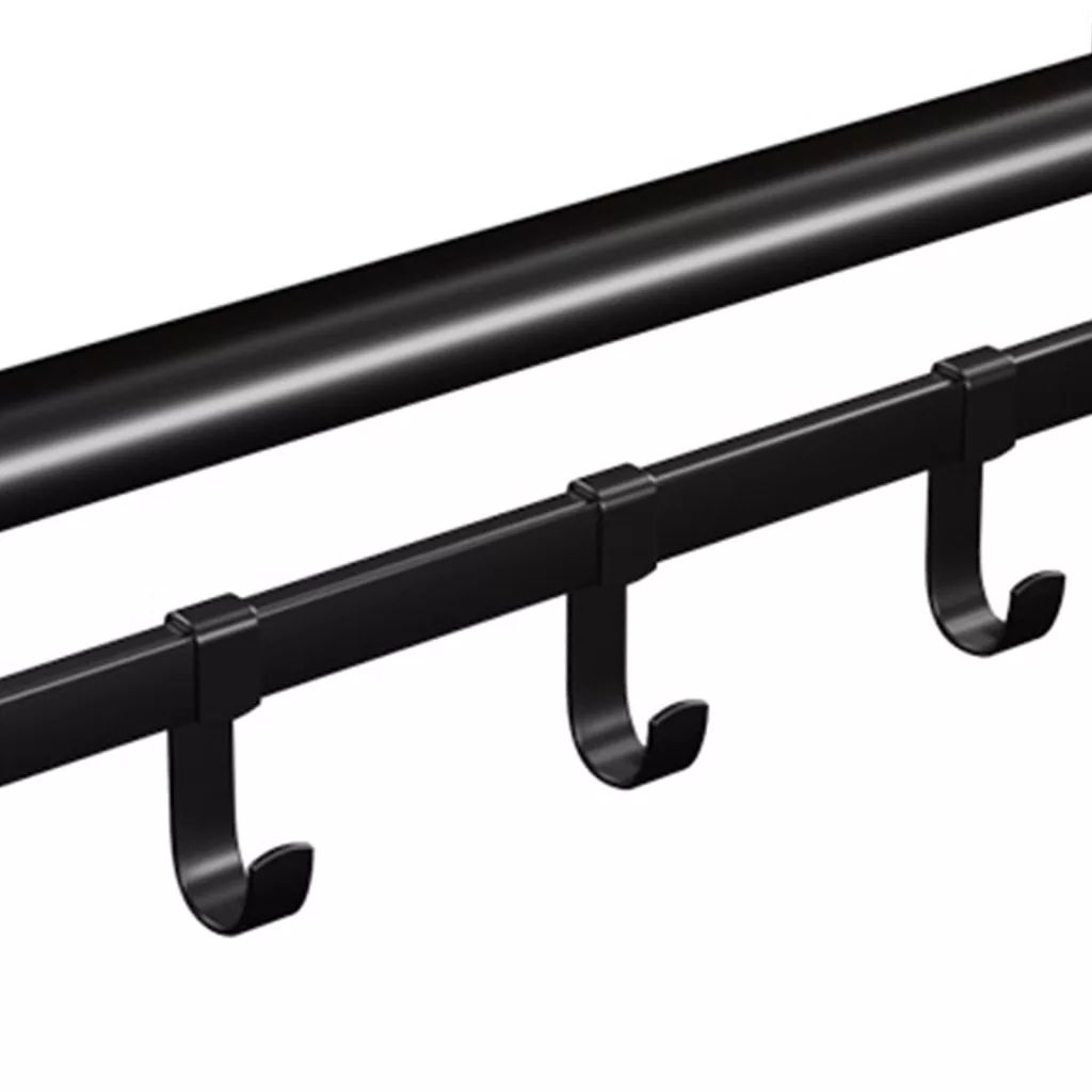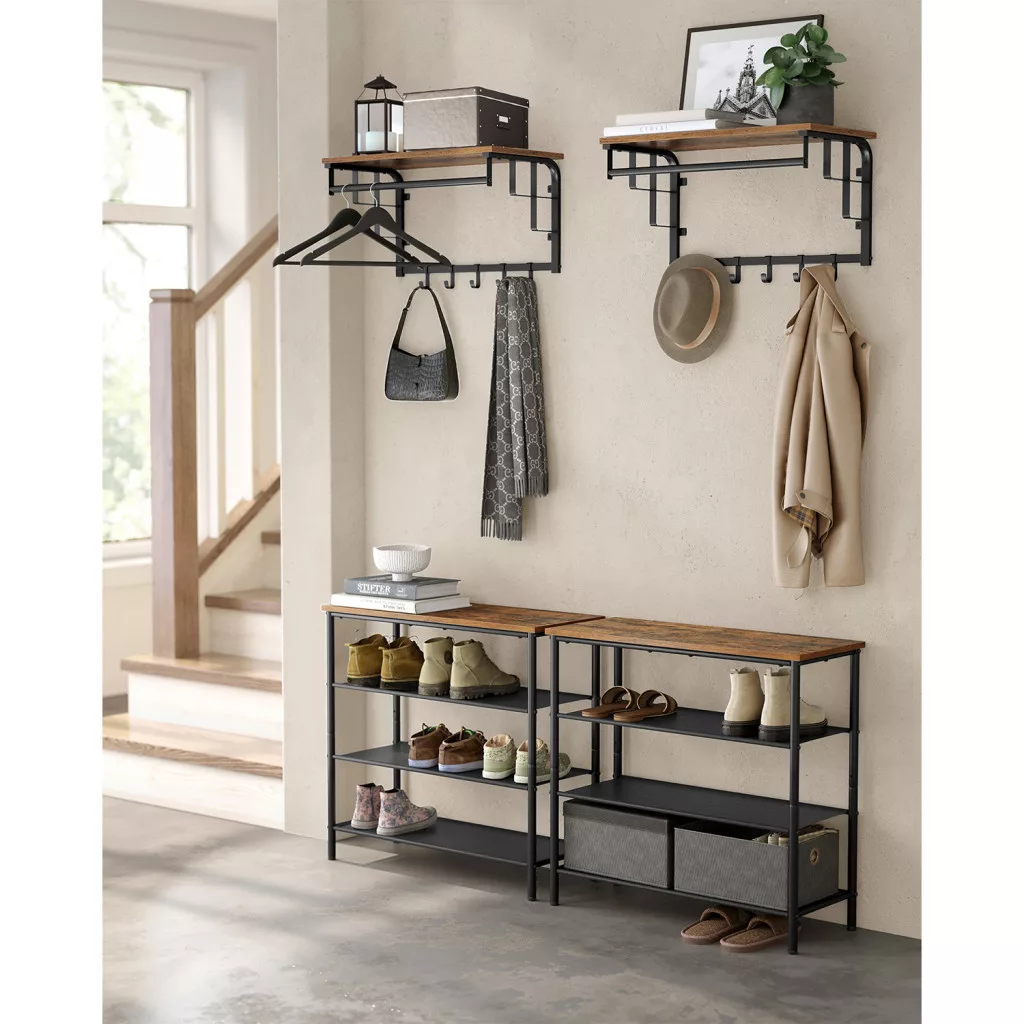 Praktikus 3 az 1-ben fali fogas rendszer, amely polcot, akasztórudat és 5 kampót egyesít. Rusztikus barna és fekete színvilága ipari stílust kölcsönöz előszobájának, miközben kabátjait, táskáit és kiegészítőit rendszerezetten tartja.