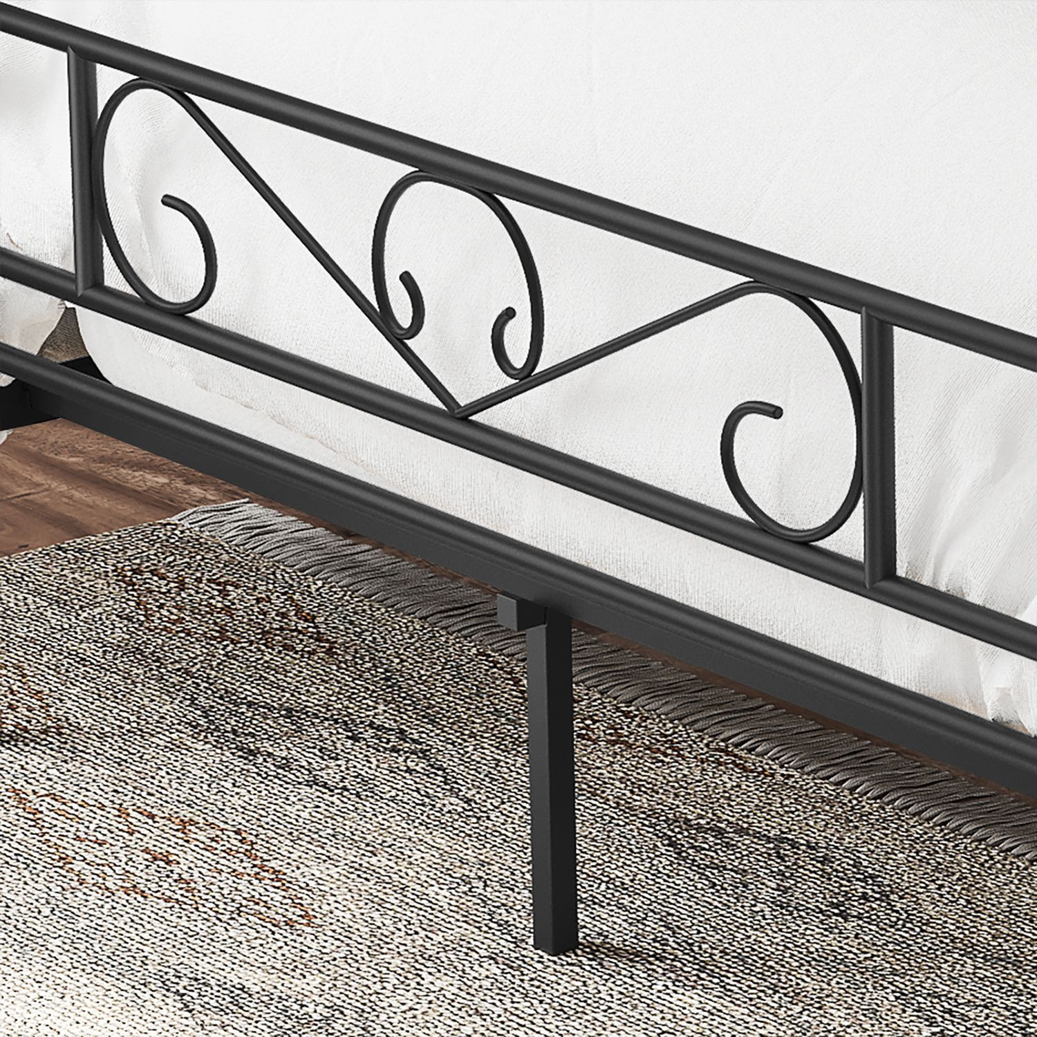 • Elegáns díszített fej- és lábvég: A fekete fém vázon található dekoratív minták stílusos megjelenést kölcsönöznek, amely feldobja a hálószoba hangulatát anélkül, hogy túlzsúfolttá válna