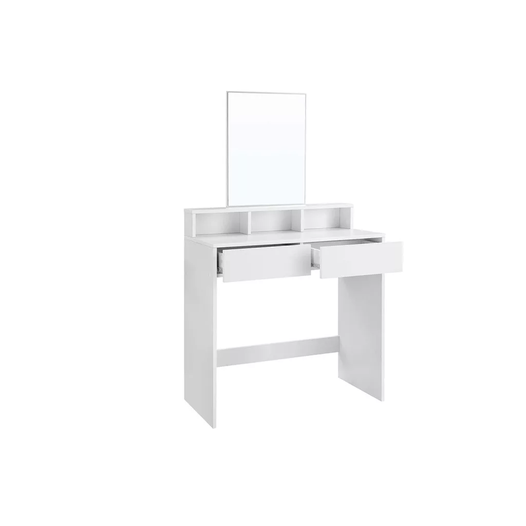 Ez a modern, fehér VASAGLE fésülködőasztal nagy téglalap alakú tükörrel, 2 fiókkal és 3 nyitott rekesszel teszi rendezettté és stílusossá reggeli szépítkezési rutinját. Praktikus tárolási lehetőségei és könnyen tisztítható felülete tökéletes választás minden hálószobába.