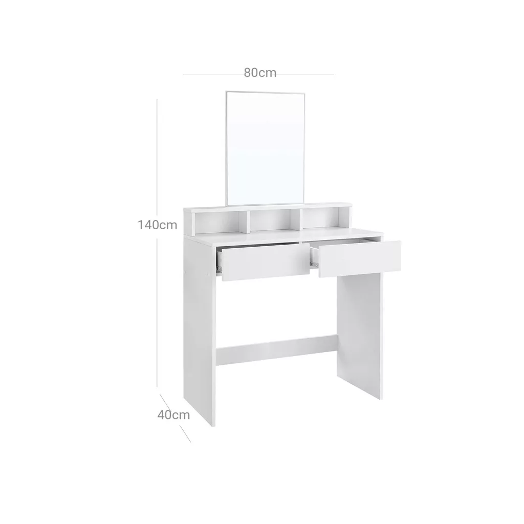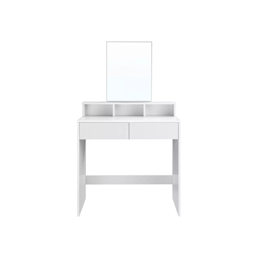 A VASAGLE fésülködőasztal a funkcionalitás és az elegáns design tökéletes ötvözete. A modern, fehér kivitelű asztal nagy téglalap alakú tükrével, 2 tágas fiókjával és 3 nyitott rekeszével minden kozmetikai eszközének helyet biztosít. A melamin bevonatú forgácslap felület könnyen tisztítható, így a sminkpor vagy az esetlegesen kiömlő alapozó sem okoz gondot. Az emelt platform tökéletes a parfümök dekoratív elhelyezésére, míg a fiókok és nyitott rekeszek rendszerezetten tárolják szemhéjfestékeit, púdereit és körömlakkjait.