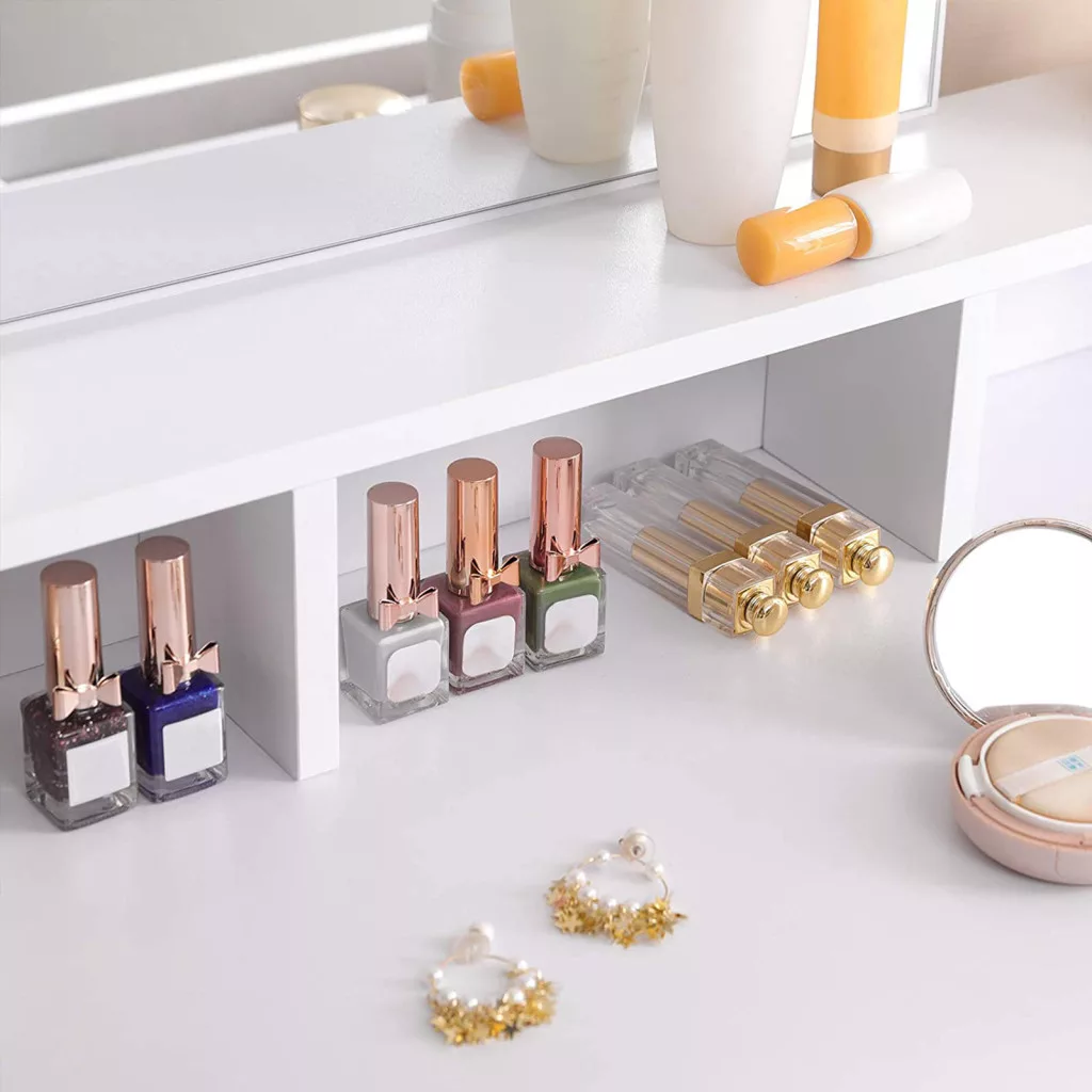 • 2 tágas fiók és 3 nyitott rekesz: Rendszerezett tárolást kínál minden kozmetikai termékének, a szemhéjfestéktől a körömlakkig, így mindig kéznél van, amire szüksége van