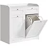 Ez a VASAGLE fürdőszobai szekrény forradalmasítja a fürdőszobai tárolást azzal, hogy ötvözi a hagyományos szekrény funkcióit a praktikus szennyestárolással. A felhőfehér MDF korpusz két tágas fiókot és egy felső polcot kínál mindennapi fürdőszobai kellékeid számára, míg az alsó részben két billenő ajtó mögött kivehető textil szennyeskosarak várják a piszkos ruhákat. A kosarak dupla fogantyúval rendelkeznek, így mosás napján egyszerűen kiemelheted és a mosógéphez viheted őket.