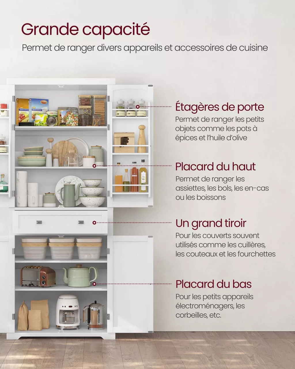 A VASAGLE magas konyhai tároló szekrény a tökéletes megoldás azok számára, akik funkcionalitást és stílust egyaránt keresnek otthonukba. Ez a 182 cm magas, szabadon álló szekrény két tágas rekesszel, egy praktikus kihúzható fiókkal és hat ajtópolccal rendelkezik, amelyek maximálisan kihasználják a rendelkezésre álló teret. A fehér színű MDF anyag és a jellegzetes bordázott ajtók farmhouse hangulatot teremtenek, miközben a gyémánt alakú fogantyúk elegáns részletet adnak a bútor megjelenéséhez.