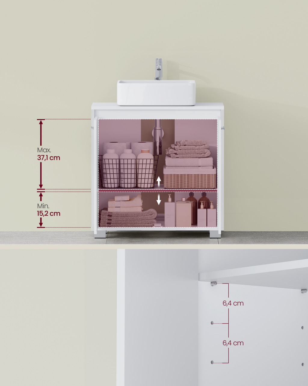 A szekrény különlegessége a 3 magasságban állítható polc, amely lehetővé teszi különböző méretű samponok és tusfürdők kényelmes elhelyezését. A stabil fémlábakon álló bútor 60 kg teherbírással rendelkezik, a mellékelt billenésgátló készlet pedig extra biztonságot nyújt. A hátsó 20 x 14,8 cm-es szifon nyílás kifejezetten falról érkező vízvezetékhez tervezett, lábazat nélküli mosdókhoz.
