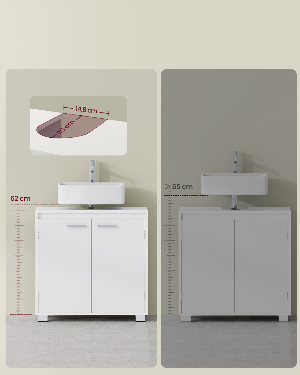 A VASAGLE mosdó alatti szekrény tökéletes megoldást kínál azoknak, akik praktikus és stílusos tárolási lehetőséget keresnek fürdőszobájukba. A tiszta vonalvezetésű, felhőfehér bútor harmonikusan illeszkedik bármilyen modern berendezésbe, miközben kiváló minőségű MDF anyagból készült, amely tartós és könnyen tisztítható. A két tágas rekesz elegendő helyet biztosít tisztítószerek, törölközők és fürdőszobai kellékek tárolására.