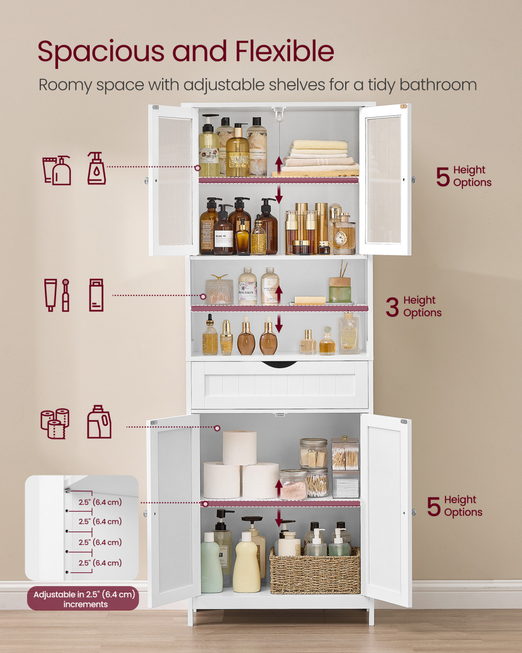 Elegáns és praktikus tárolószekrény, amely stílust és rendezett tárolást biztosít otthonában. Állítható polcokkal, tágas fiókkal és akril ajtókkal felszerelt, sokoldalú megoldás fürdőszobába, konyhába vagy nappali szobába.