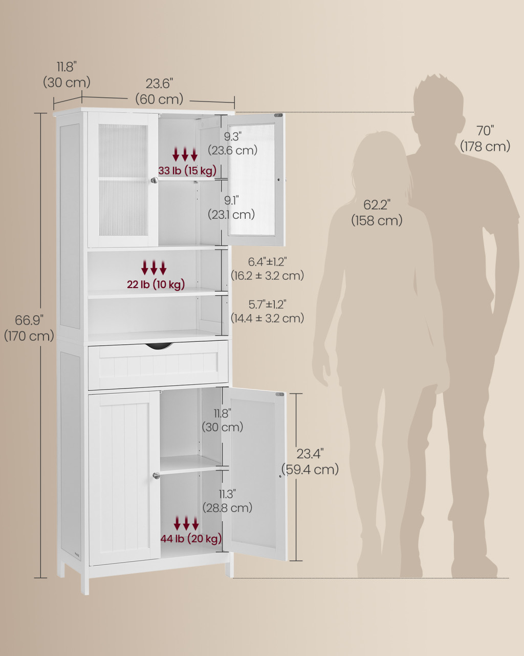 Ez a modern tárolószekrény tökéletes választás azok számára, akik praktikus és esztétikus tárolási megoldást keresnek otthonukba. A felhőfehér színű, MDF anyagból készült bútor 2 zárt szekrénnyel, 2 nyitott rekesszel és egy tágas fiókkal rendelkezik, amelyek bőséges tárolóhelyet biztosítanak fürdőszobai kellékek, konyhai eszközök vagy nappali szobai tárgyak számára. Az állítható polcok lehetővé teszik, hogy különböző méretű tárgyakat is kényelmesen elhelyezzen, míg az elegáns akril ajtók finom betekintést engednek a szekrény tartalmába, miközben megőrzik a diszkréciót.