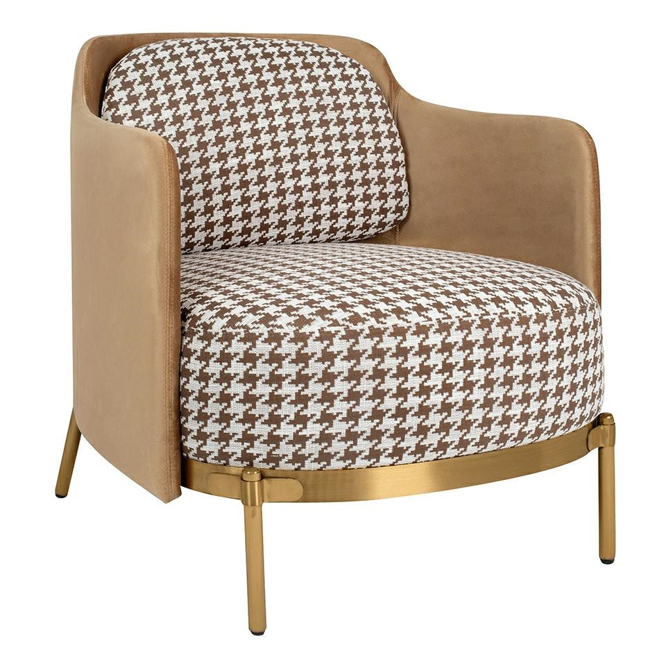 A Venice fotel ötvözi a klasszikus pepita mintázat időtlen báját a modern formatervezés letisztult vonalaival. A fehér-barna pepita kárpitozású ülőfelület és háttámla harmonikusan illeszkedik a bézs színű velúr oldalsó és hátsó borításhoz, míg az arany színű fém váz különleges eleganciát kölcsönöz a darabnak.