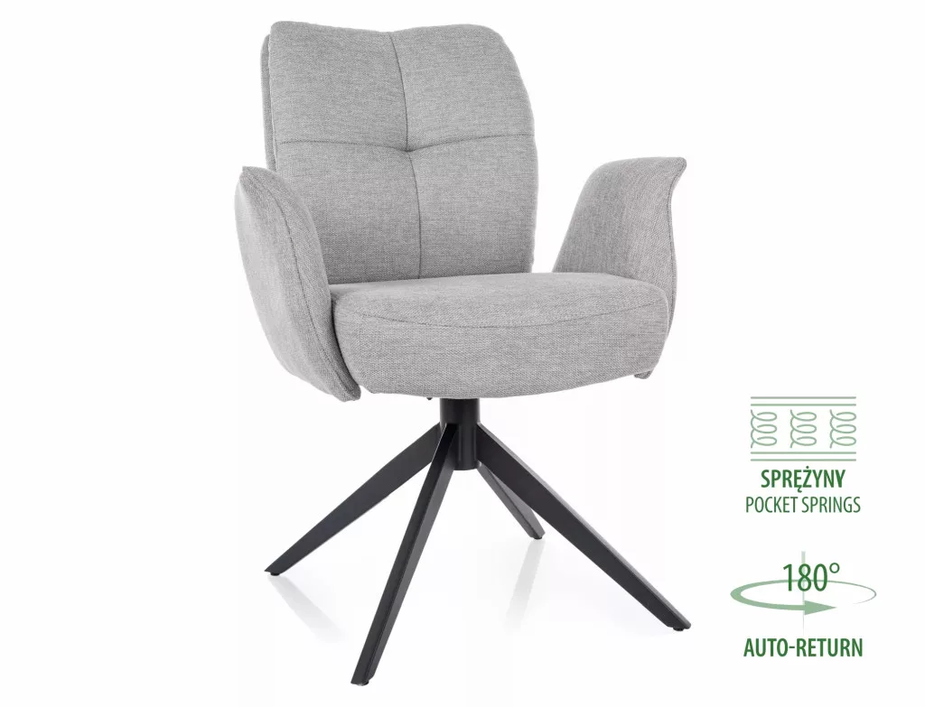 Modern, forgó étkezőszék kényelmes kárpitozással és auto-return funkcióval, amely tökéletes választás az étkezőbe vagy dolgozószobába.