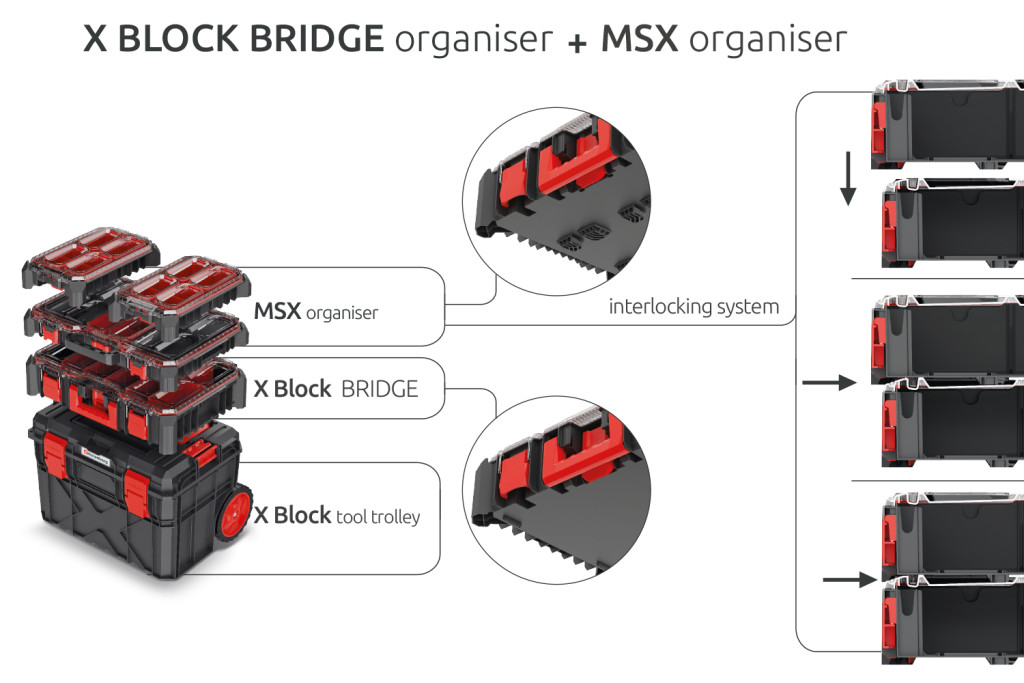 Innovatív, kettős funkciójú szerszámrendező adapter, amely egyesíti a tárolást és a különböző X BLOCK rendszerek összekapcsolását.