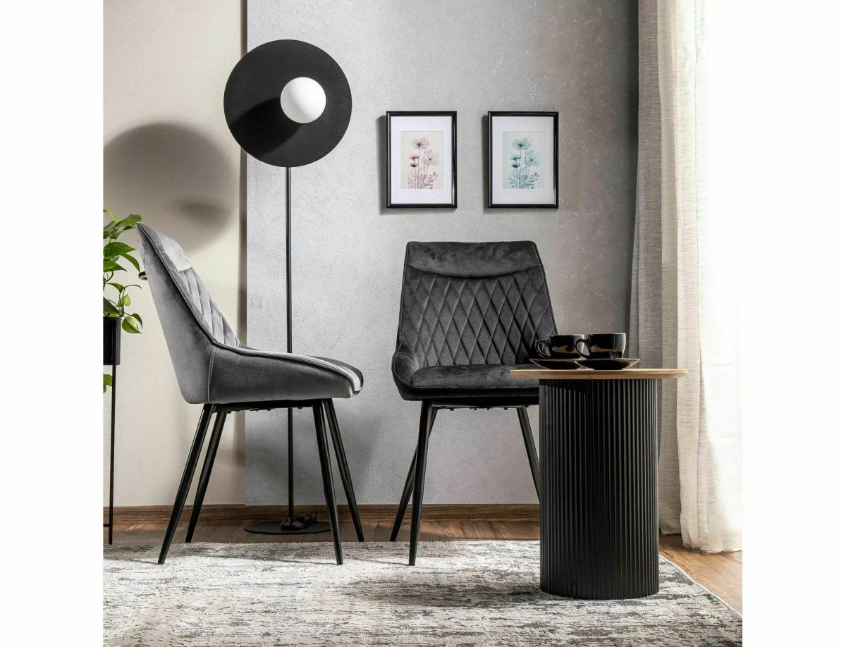 Az Agat Velvet étkezőszék a modern design és a kényelem tökéletes ötvözete. A szék steppelt háttámlája és ülőfelülete puha, szürke bársonnyal van kárpitozva, ami kellemes tapintást és luxus megjelenést biztosít. A karcsú, matt fekete fémlábak stabilitást és időtlen eleganciát kölcsönöznek a széknek. A háttámla praktikus fogantyúval rendelkezik, ami megkönnyíti a szék mozgatását.