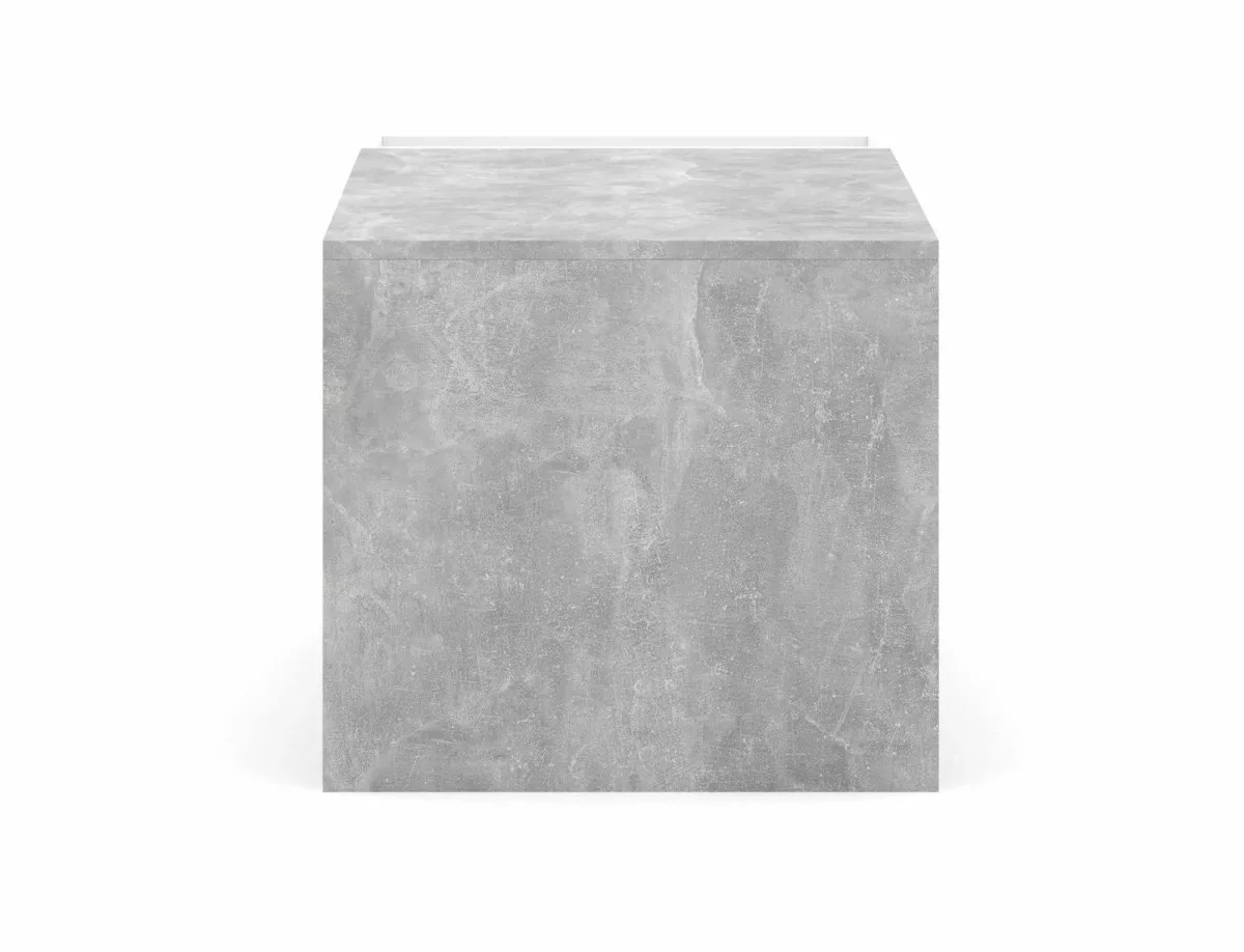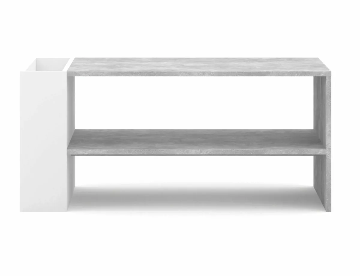 Modern dohányzóasztal laminált lappal, amely tökéletesen ötvözi a szürke beton hatást és a matt fehér színt. Praktikus tárolórekeszekkel és nyitott polccal rendelkezik, ami ideális megoldás a nappali térhez.