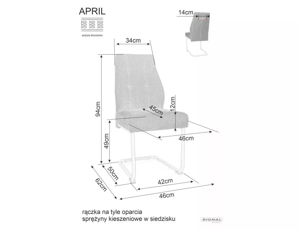 Az April Vardo szék a modern étkezők tökéletes kiegészítője. A szürke Vardo szövettel kárpitozott ülés és háttámla tűzött mintázata különleges megjelenést kölcsönöz. A matt fekete fém szánkótalp váz stabilitást és időtlen dizájnt biztosít. A szék háttámláján praktikus fogantyú található, ami megkönnyíti a mozgatást.