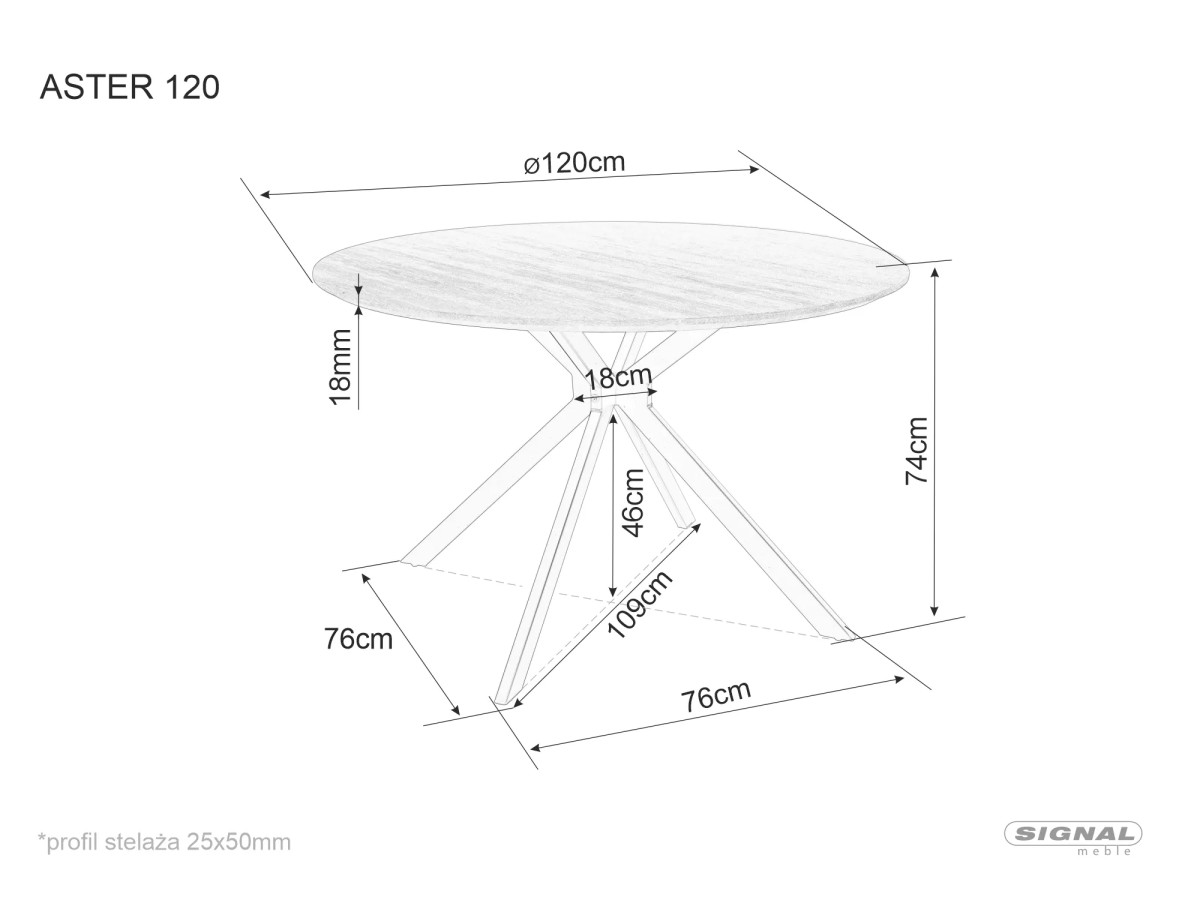 Az Aster étkezőasztal tökéletes választás a modern otthonokba. A 120 cm átmérőjű kerek asztallap fehér márványhatású MDF-ből készült, amit stabil, matt fekete fémlábak tartanak. A különleges csillag alakú lábszerkezet nem csak stabil tartást biztosít, de szemet gyönyörködtető látványt is nyújt. Az asztal 76 cm magas, így kényelmes étkezést biztosít akár 7 személy részére is.