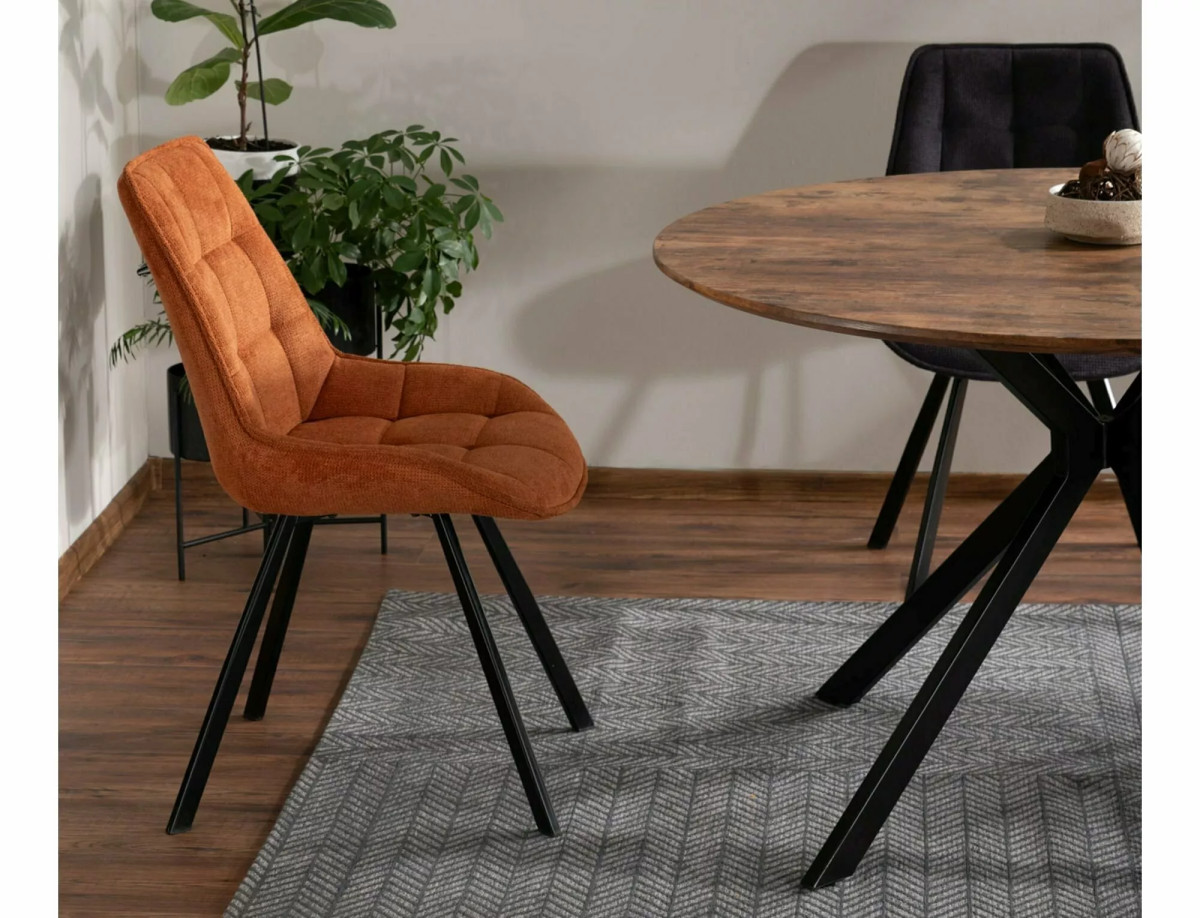 Modern kerek étkezőasztal vintage dió színű MDF asztallappal és matt fekete fém csillag vázzal. Tökéletes választás 6 személy számára, stílusos és időtlen dizájnnal.