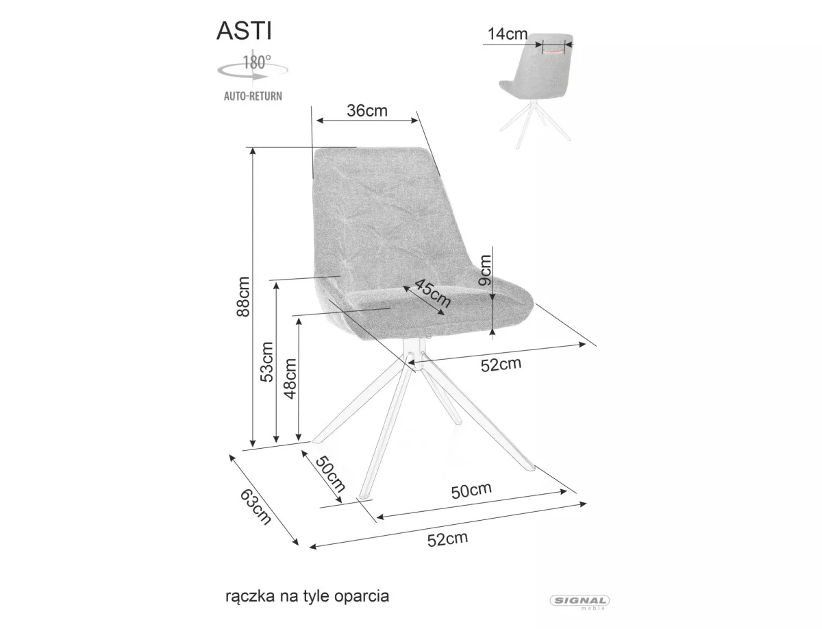 Az Asti Brego étkezőszék a modern design és funkcionalitás tökéletes ötvözete. A szék elegáns bézs Brego szövettel kárpitozott, amely puha tapintású és tartós. A matt fekete fém váz stabil alapot biztosít, míg a 180 fokos forgó ülőrész auto-return funkcióval rendelkezik, amely automatikusan visszatér eredeti pozíciójába. A háttámla praktikus fogantyúval van ellátva a könnyű mozgathatóság érdekében.