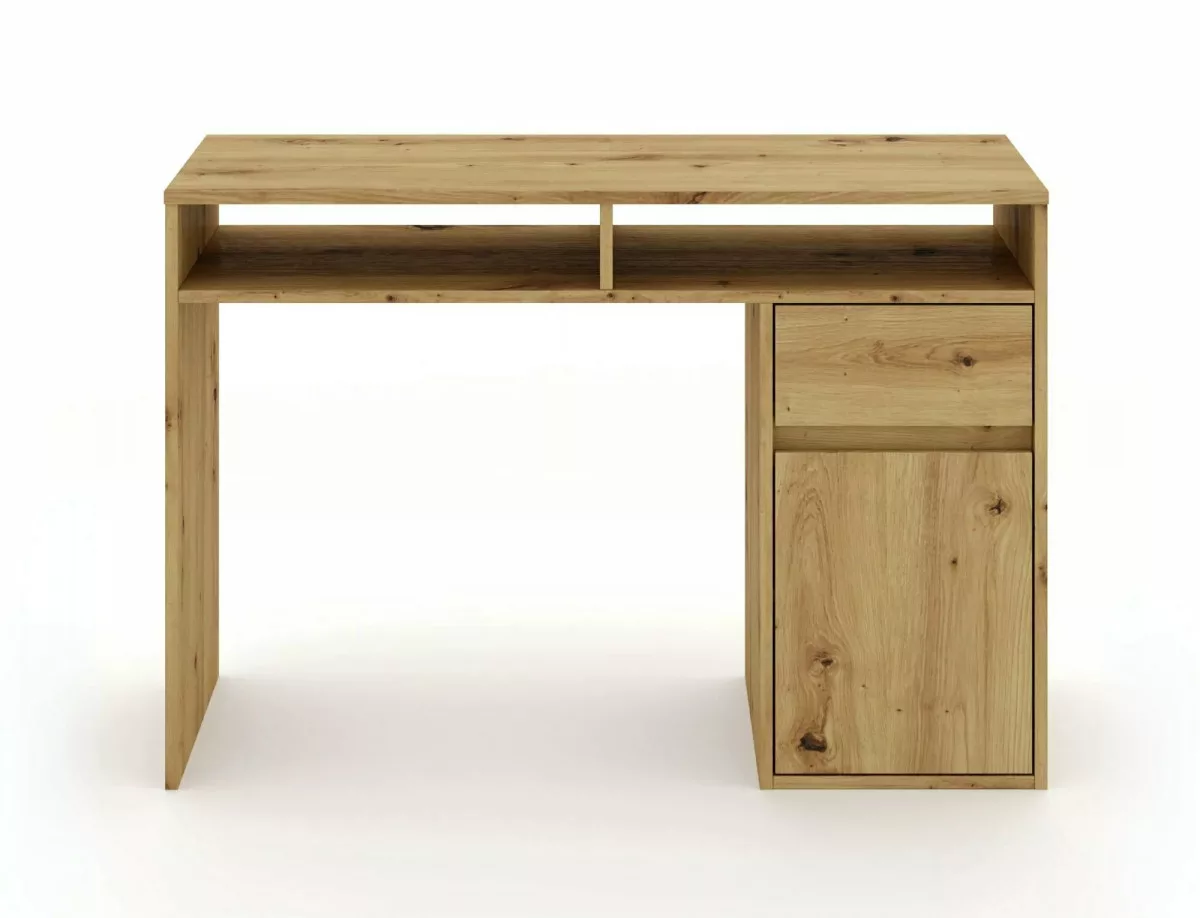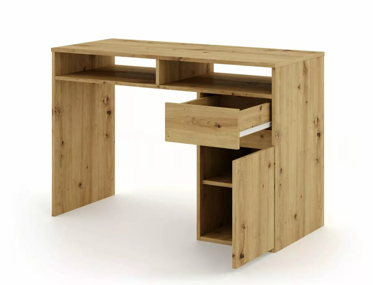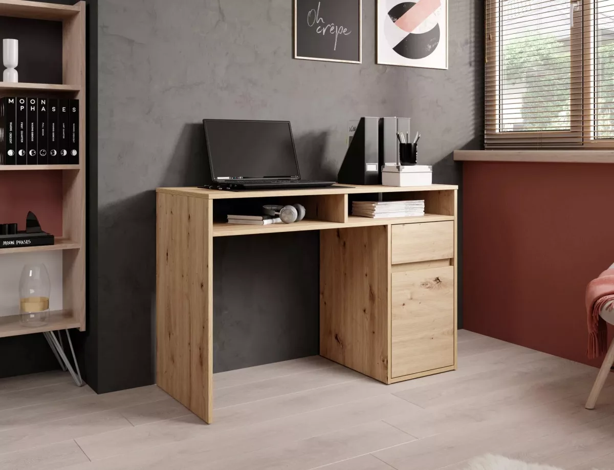 Modern, praktikus íróasztal laminált lappal és fiókkal, artisan tölgy színben. Tökéletes választás otthoni irodába vagy dolgozószobába, nyitott tárolórekeszekkel és kompakt méretekkel.