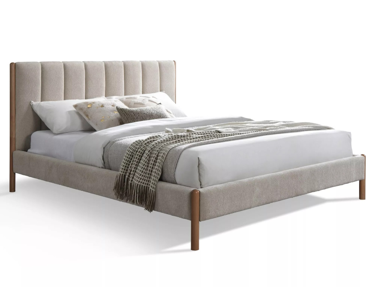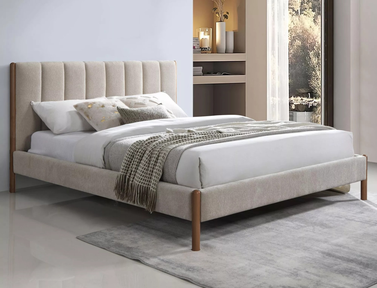 A Belmont Raven ágy a modern hálószoba tökéletes központi eleme. A függőleges bordázott fejtámla és a világos bézs szövetborítás elegáns megjelenést kölcsönöz. A 160x200 cm-es méret bőséges helyet biztosít két személy számára. A világos diófa lábak és keret harmonikusan illeszkednek a kárpitozáshoz.