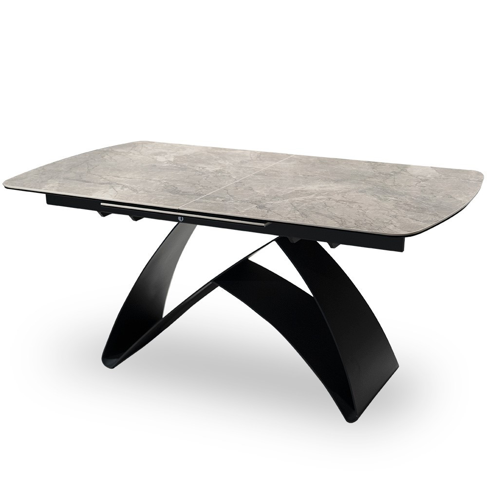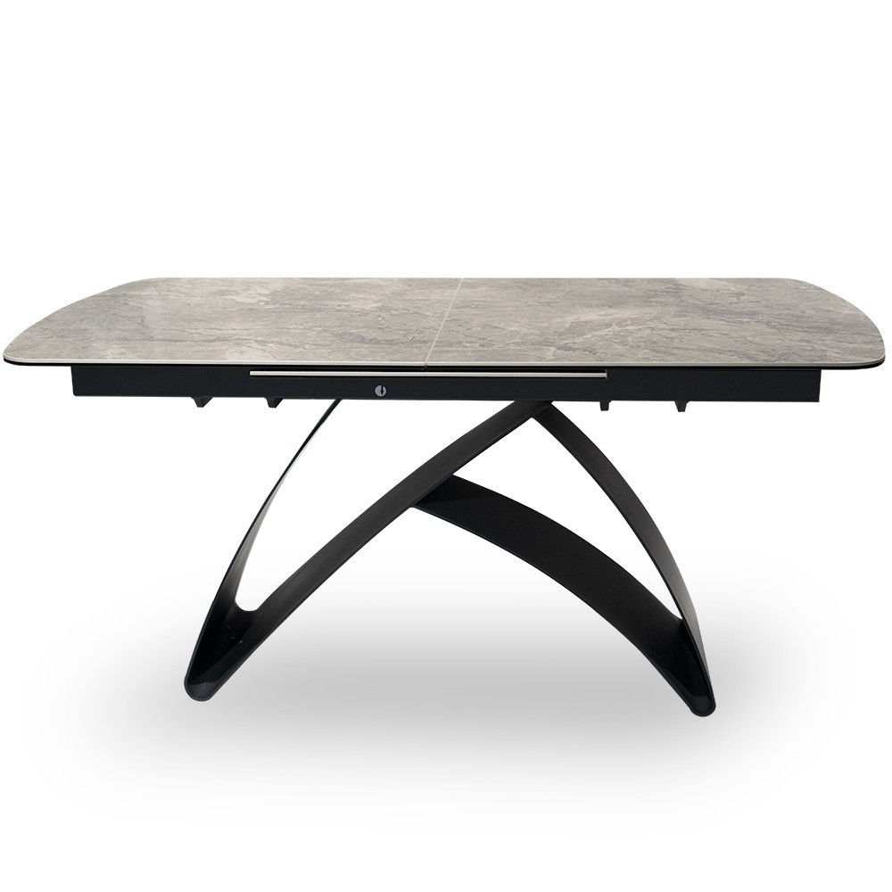 Modern, kinyitható étkezőasztal prémium kerámia asztallappal és egyedi fekete acél lábszerkezettel. A 160-220 cm-re bővíthető asztallap tökéletes választás nagyobb családi összejövetelekhez.