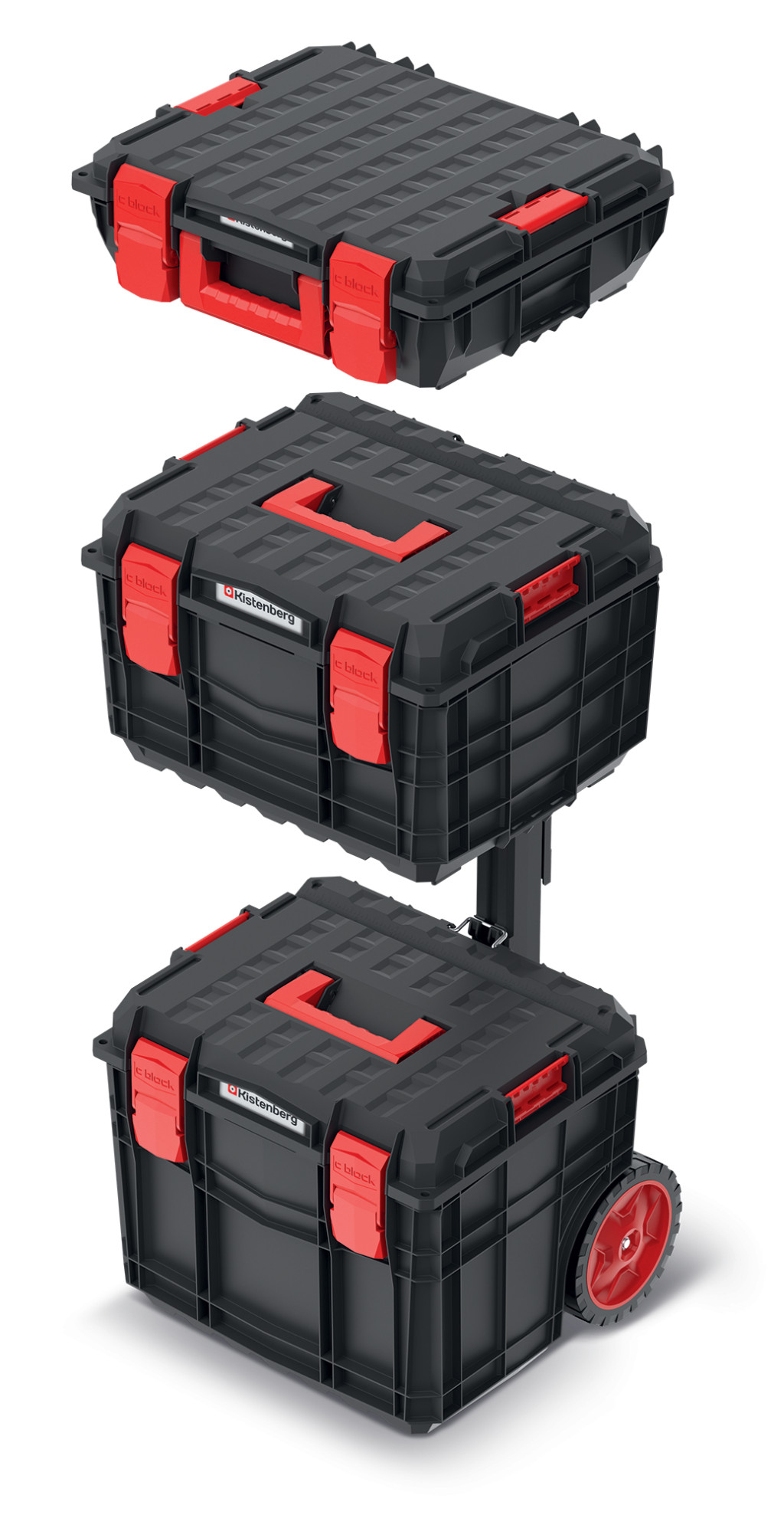 Minden modul rendelkezik kivehető elválasztókkal és szerszámtartókkal, valamint beépített mérőszalaggal a fedélben. A rendszer különlegessége a teleszkópos fogantyú és a nagy teherbírású kerekek, amelyek könnyű szállíthatóságot biztosítanak akár teljes terhelés mellett is.