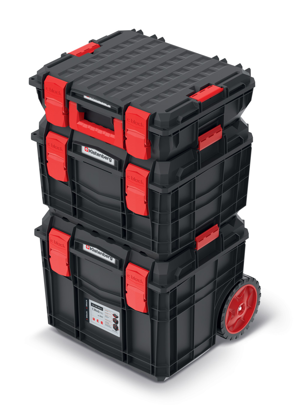 A C Block Pro szerszámosláda szett egy komplett tárolási megoldást kínál három különböző méretű, egymással kompatibilis elemmel. A rendszer alapját egy nagy teherbírású, kerekekkel ellátott alsó láda képezi, amelyre további modulok építhetők. A polimer házak porállók és vízállók, míg a beépített tömítések maximális védelmet biztosítanak a szerszámoknak.
