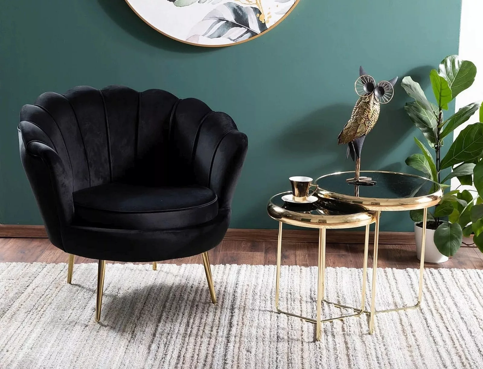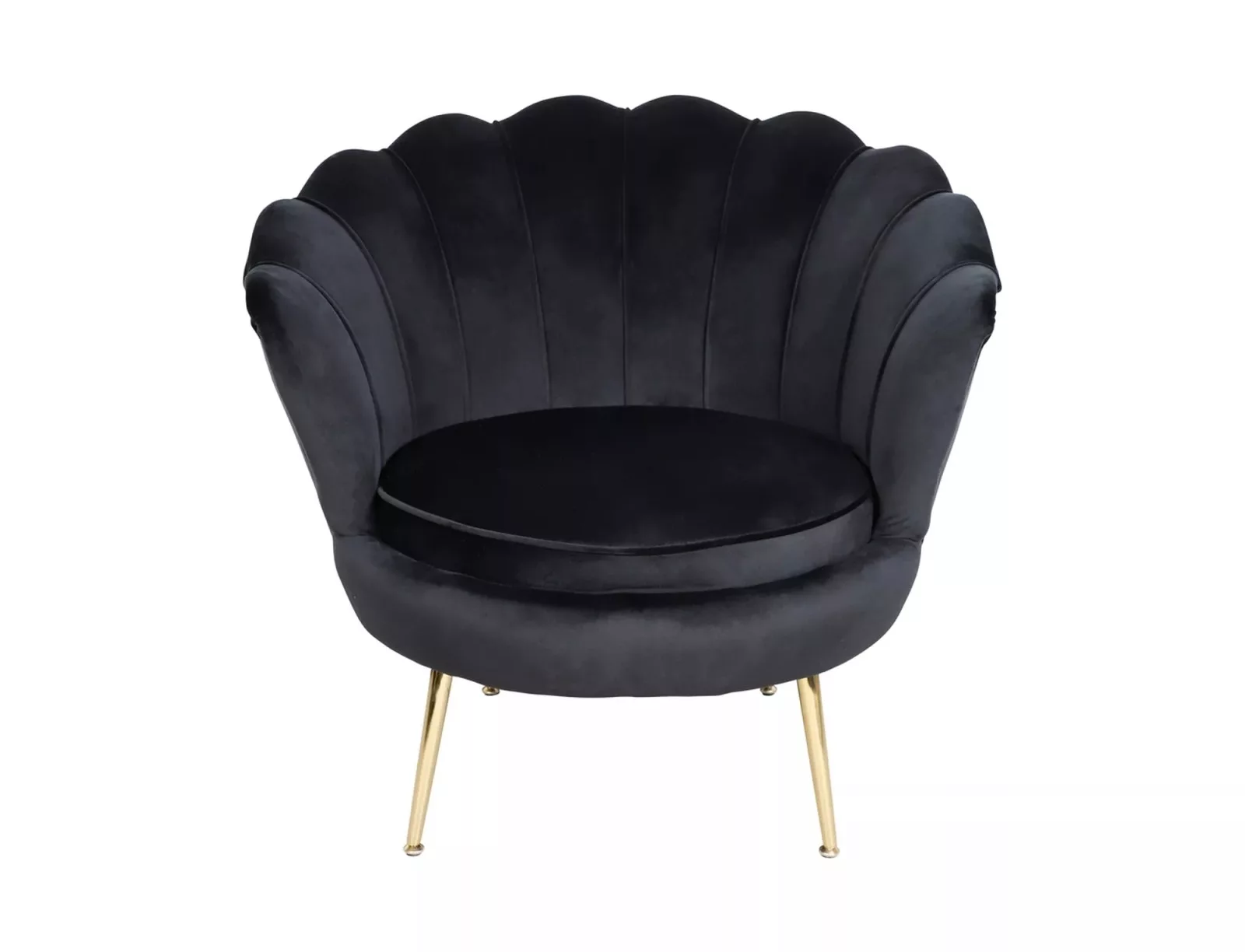 Elegáns kagyló formájú fotel luxus fekete bársony kárpitozással és stílusos arany színű fémlábakkal. Tökéletes választás modern és klasszikus belső terekbe egyaránt, kényelmes ülőfelülettel és szemet gyönyörködtető dizájnnal.