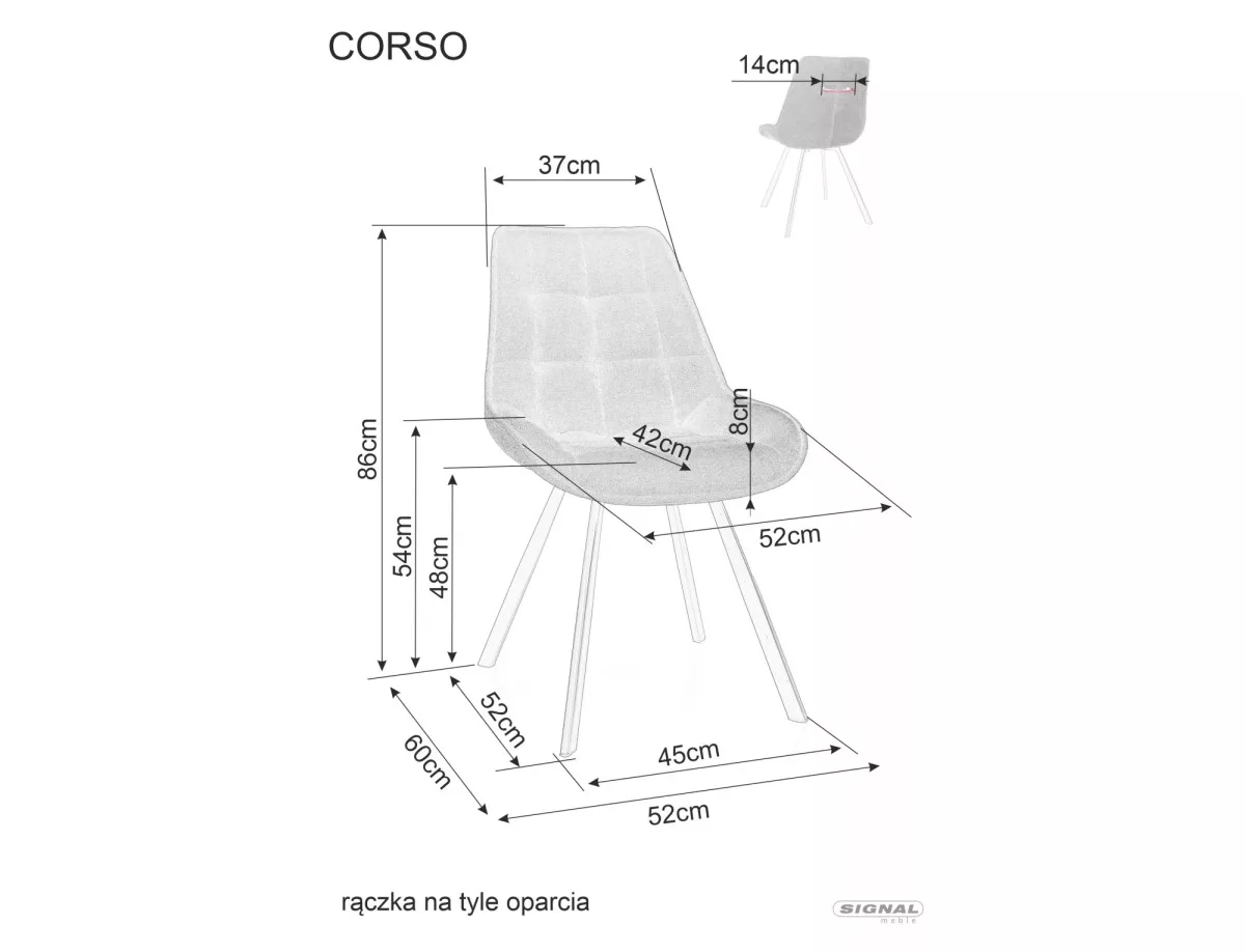 A Corso Vardo szék a modern dizájn és a kényelem tökéletes ötvözete. A szék kárpitozása kiváló minőségű Vardo szövetből készült, amely kellemes tapintású és tartós. A matt fekete fém váz stabil alapot biztosít, míg a háttámla praktikus fogantyúval van ellátva a könnyebb mozgathatóság érdekében. A szék 86 cm magas, 52 cm széles, és a 48 cm-es ülésmagasság optimális kényelmet biztosít.