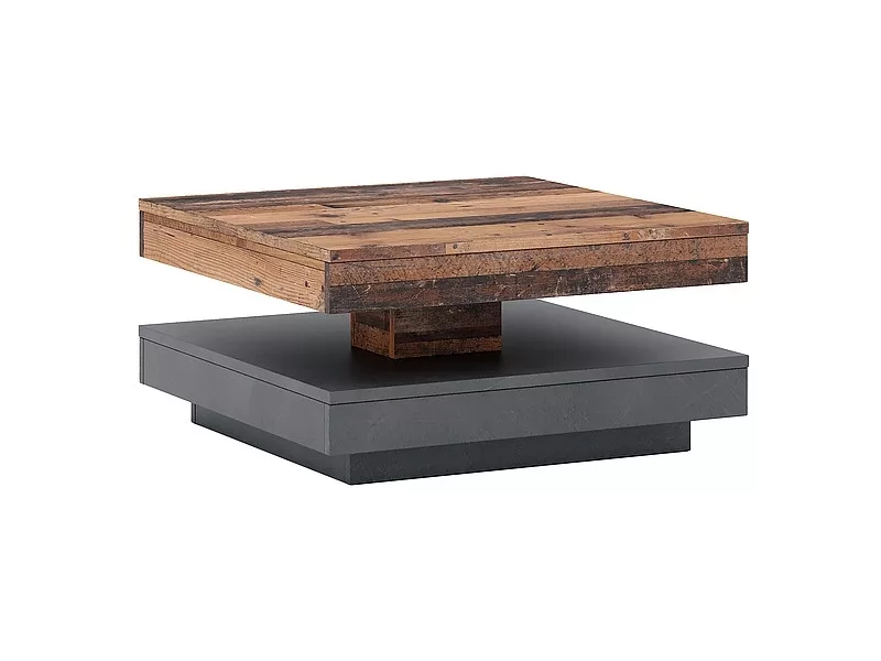 Modern, négyzet alakú dohányzóasztal 360°-ban forgatható felső lappal, amely tökéletesen ötvözi az ófa és sötétszürke színek kontrasztját. Ideális választás a kortárs nappalikba.