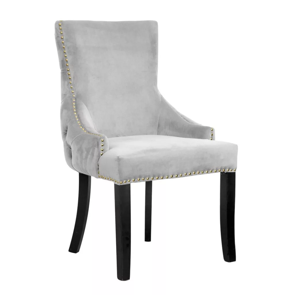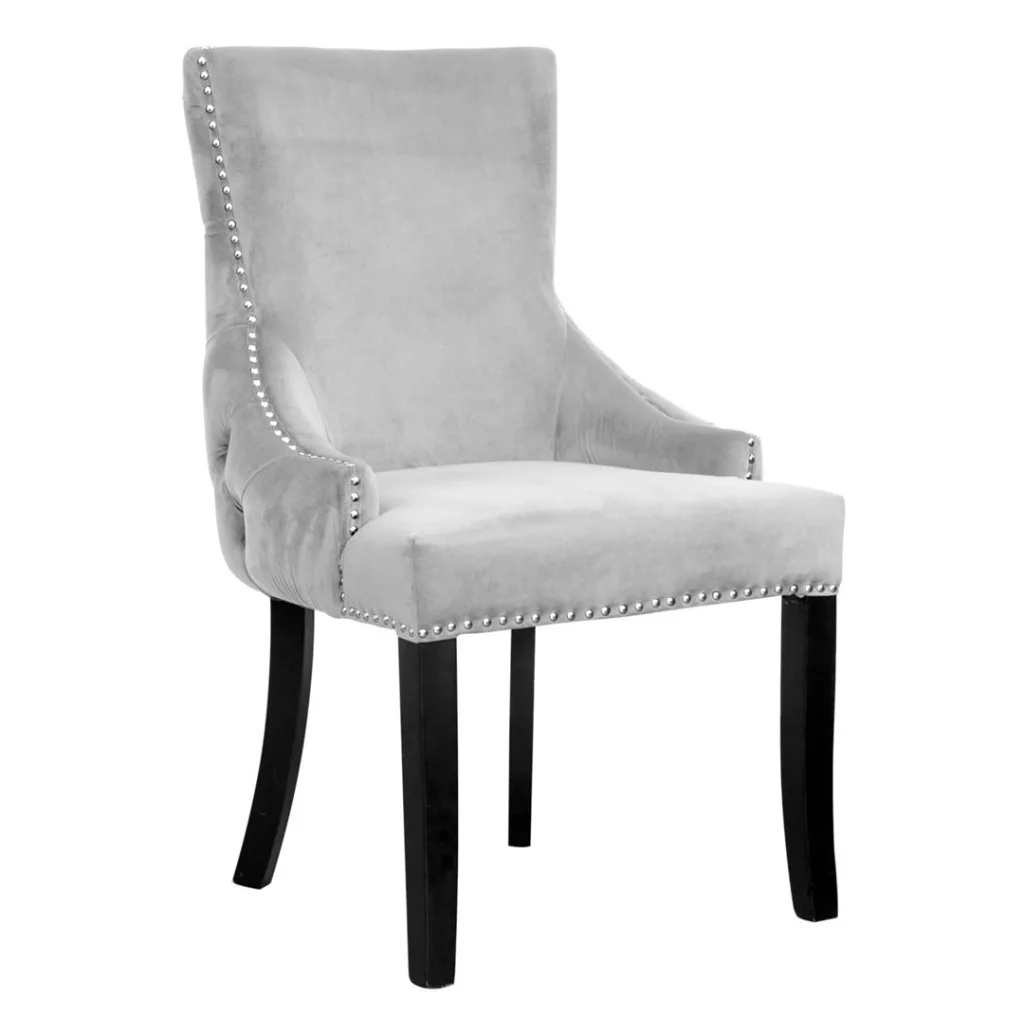 Elegáns Edward étkező szék prémium szürke bársony kárpitozással és dekoratív szegecseléssel. A wenge színű fa lábak és a kényelmes párnázott kialakítás tökéletes kombinációja luxus megjelenést kölcsönöz otthonának.