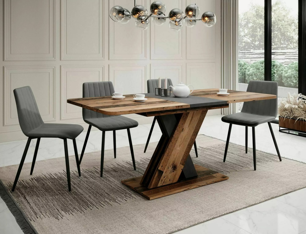 Modern kihúzható étkezőasztal, amely tökéletesen ötvözi a praktikumot és az esztétikumot. Az old wood és sötétszürke színkombináció, valamint az egyedi X-lábszerkezet különleges megjelenést kölcsönöz ennek a sokoldalú bútordarabnak.