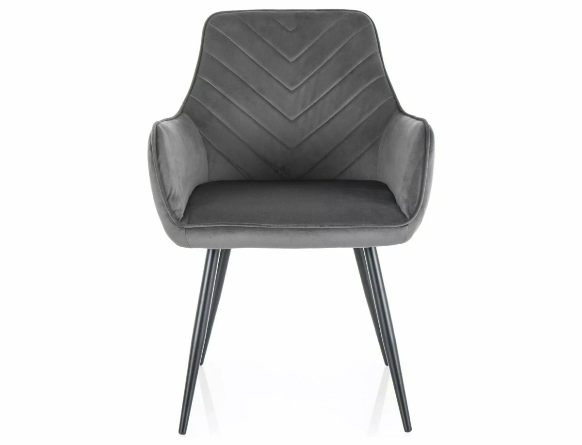 A Fig Velvet étkezőszék a modern otthonok tökéletes kiegészítője. A szék puha, szürke bársony kárpitozása és geometrikus háttámlája egyedi megjelenést kölcsönöz. A matt fekete fém váz stabil alapot biztosít, míg a karfák extra kényelmet nyújtanak. A V-alakú varrások a háttámlán különleges designelemként szolgálnak, emelve a szék esztétikai értékét.