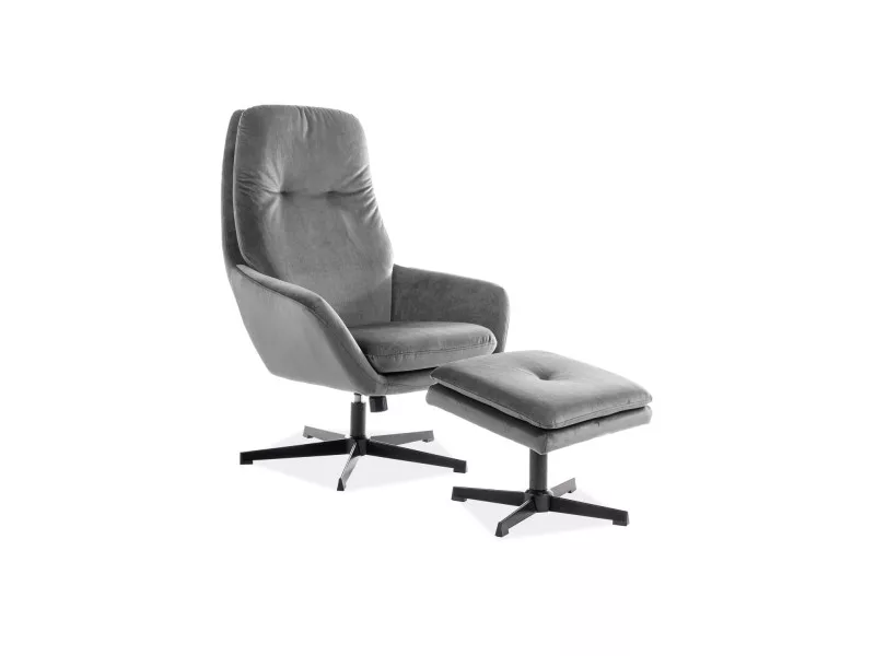A Ford Velvet pihenőfotel a modern design és a maximális kényelem tökéletes ötvözete. A szürke bársony kárpitozású fotel TILT mechanizmussal rendelkezik, amely lehetővé teszi a háttámla dőlésszögének beállítását. A fekete fém lábszerkezet stabil alapot biztosít, míg a hozzá tartozó lábtartó tovább fokozza a kényelmet. A fotel ergonomikus kialakítása tökéletes támaszt nyújt a hátnak és a fejnek.