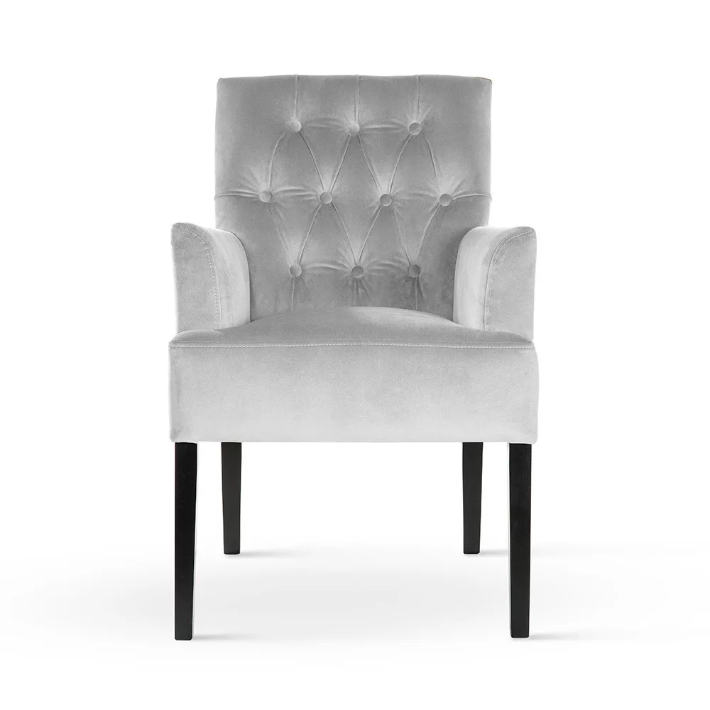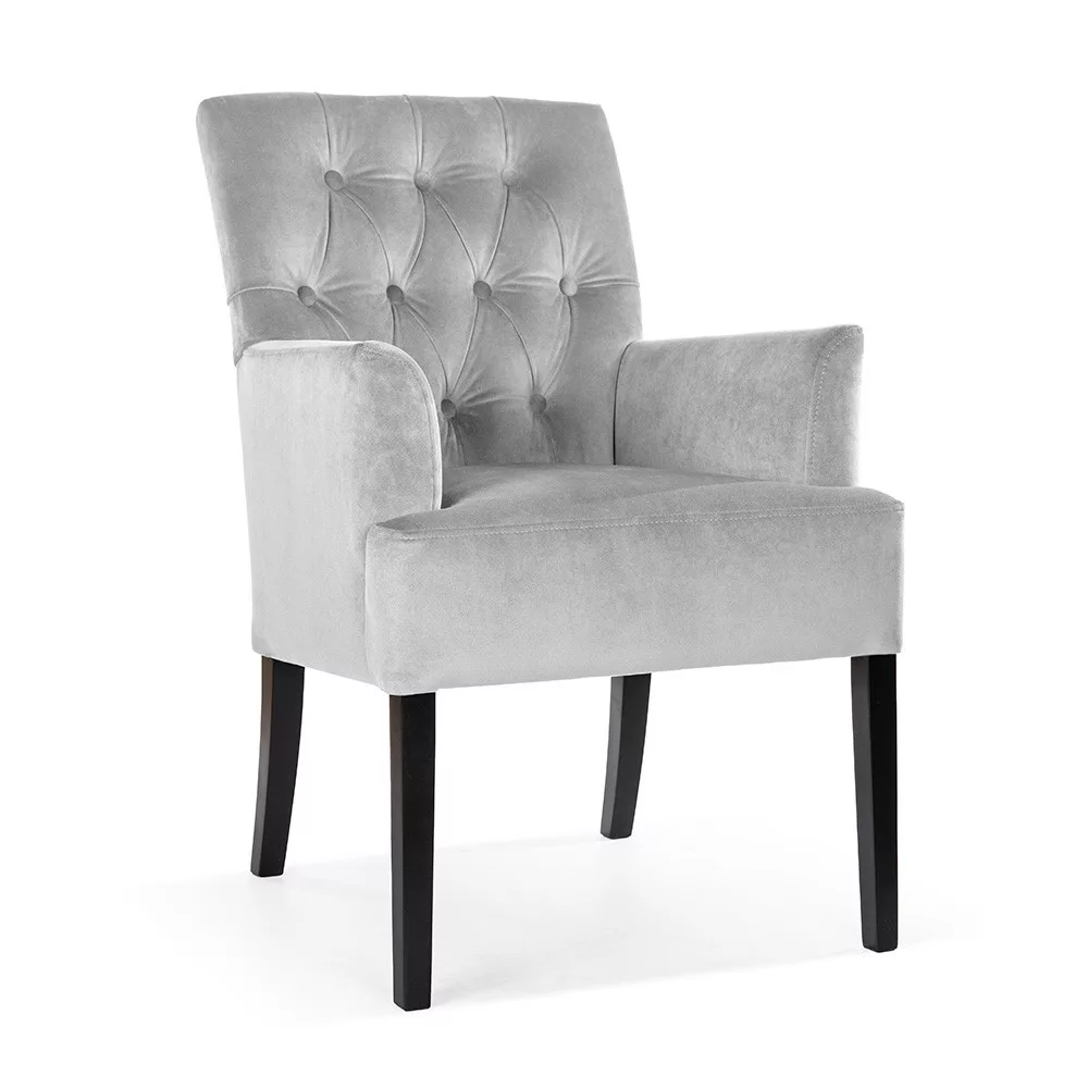 A GALA karfás fotel a kifinomult elegancia és a maximális kényelem tökéletes ötvözete. A háttámla gyönyörű, kézzel tűzött chesterfield mintázata, a puha bársony kárpitozás és az ergonomikus kialakítás teszi ezt a bútordarabot különlegessé. A sötét wenge színű fa lábak harmonikus kontrasztot alkotnak a szürke kárpitozással.