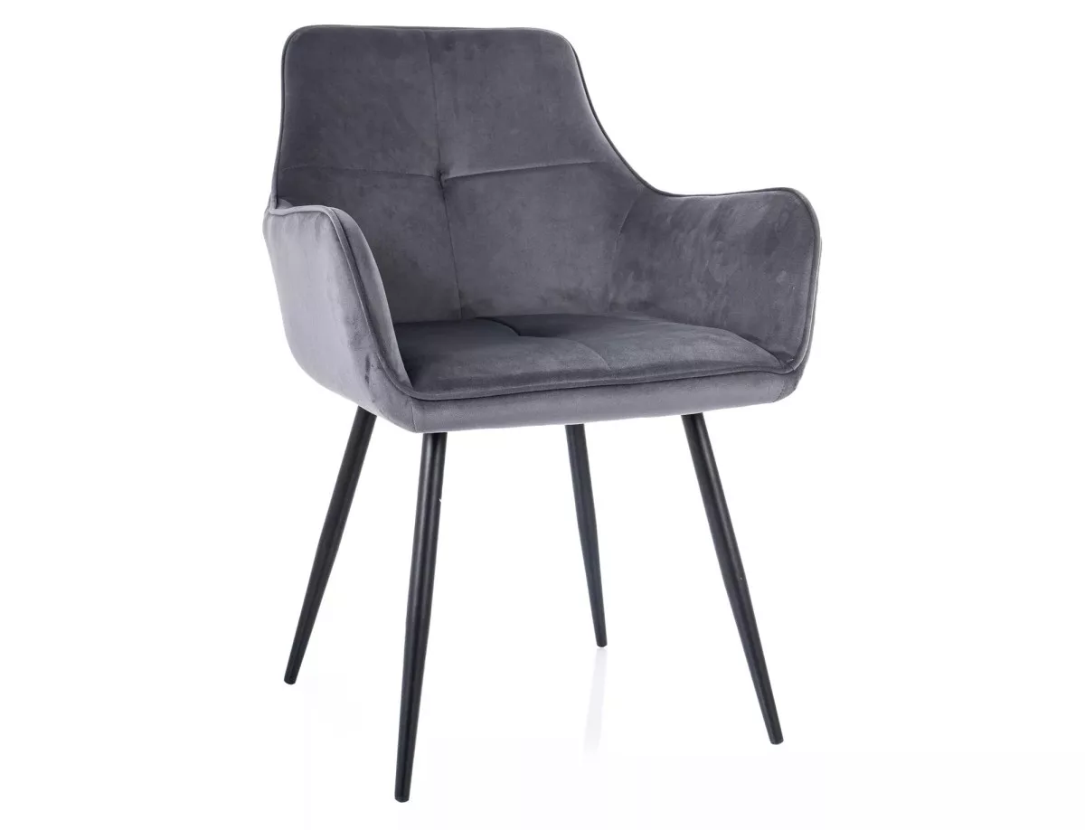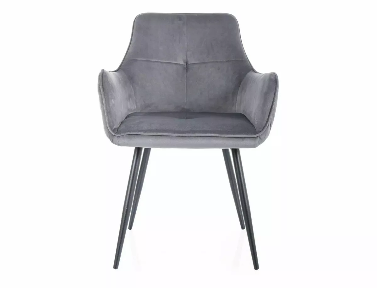 A Grape Velvet étkezőszék a modern otthonok tökéletes kiegészítője. A szék puha, szürke bársony kárpitozása és karcsú fekete fém lábai harmonikus egységet alkotnak. A szék ergonomikus kialakítása és párnázott ülőfelülete maximális kényelmet biztosít. A karfák elegáns íve és a háttámla finom varrásai kifinomult megjelenést kölcsönöznek a széknek. A 85 cm magas szék tökéletesen illeszkedik a standard magasságú étkezőasztalokhoz.