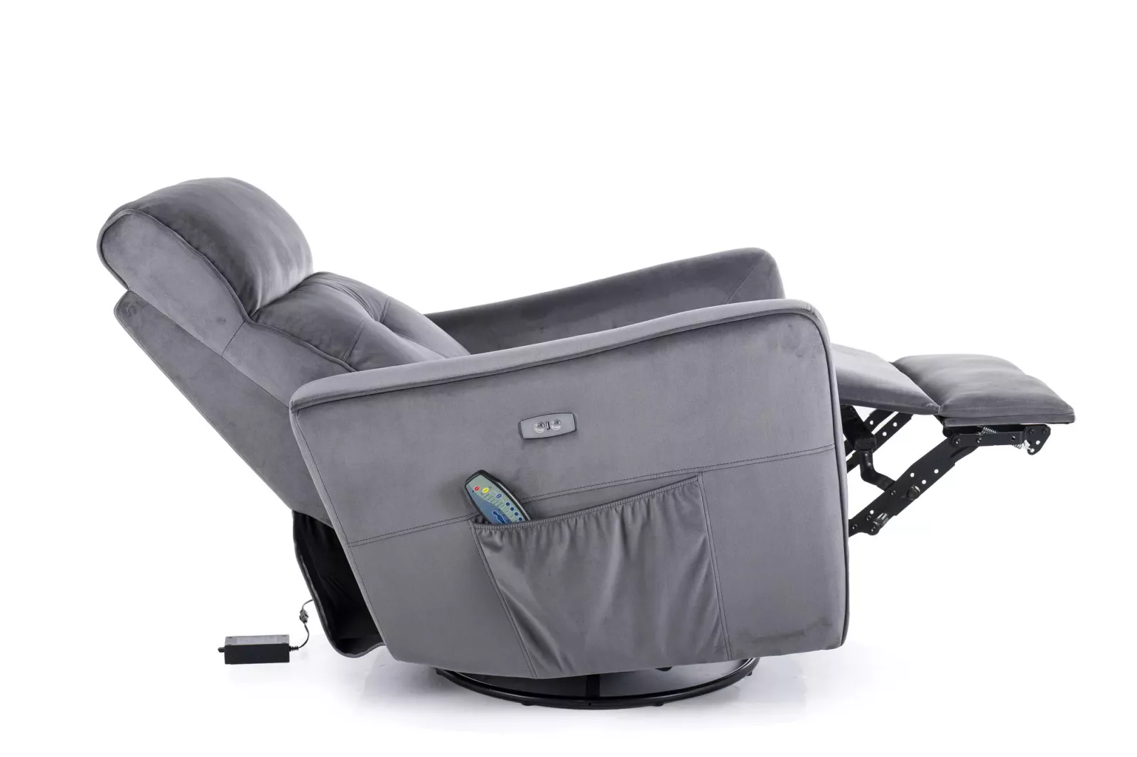 A Helios M elektromos masszázsfotel a modern lakberendezés és a maximális kényelem tökéletes ötvözete. A puha, szürke bársony kárpitozás és az elegáns vonalvezetés azonnal magára vonja a figyelmet. A fotel elektromos vezérléssel dönthető, 360 fokban forgatható, és beépített masszázsfunkcióval rendelkezik. A karfa praktikus USB porttal is fel van szerelve az eszközök töltéséhez.