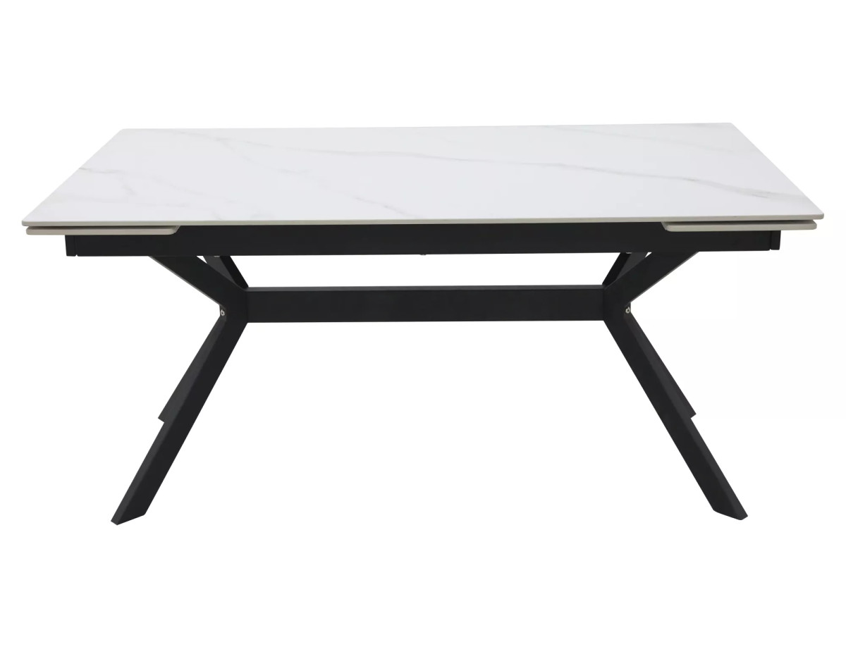Modern, kihúzható étkezőasztal kerámia asztallappal és stílusos fém vázzal, amely tökéletes választás a tágas étkezőterekbe.