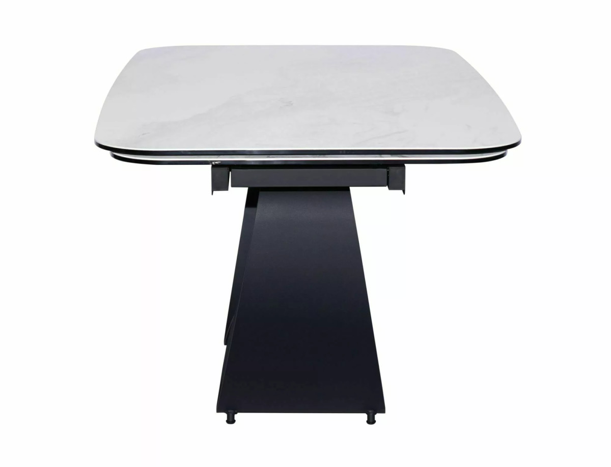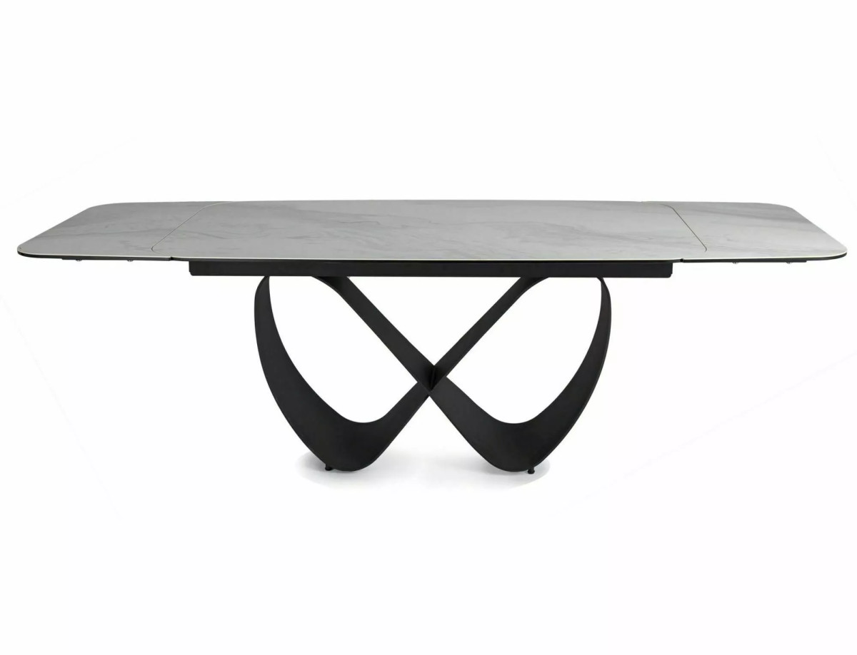 Modern, bővíthető étkezőasztal egyedi végtelen alakú lábszerkezettel, amely ötvözi a Nature Cloud kerámia és edzett üveg felületet a matt fehér és fekete színekkel. Elegáns megjelenésével és praktikus kialakításával akár 12 fő kényelmes étkezését is biztosítja.