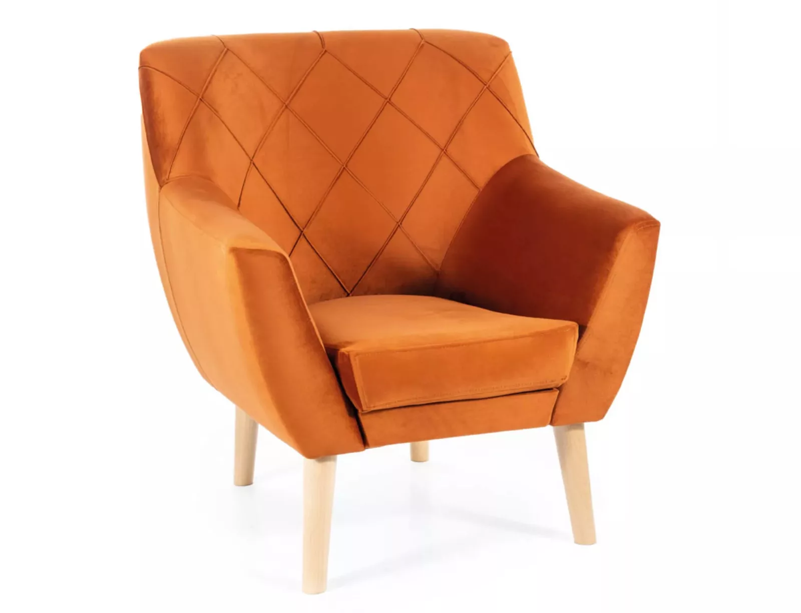 Elegáns, skandináv stílusú fotel fahéj színű bársony kárpitozással és bükk lábakkal. A rombusz mintás steppelt háttámla és a kényelmes ülőpárna tökéletes kombinációt alkot a modern és klasszikus design között.