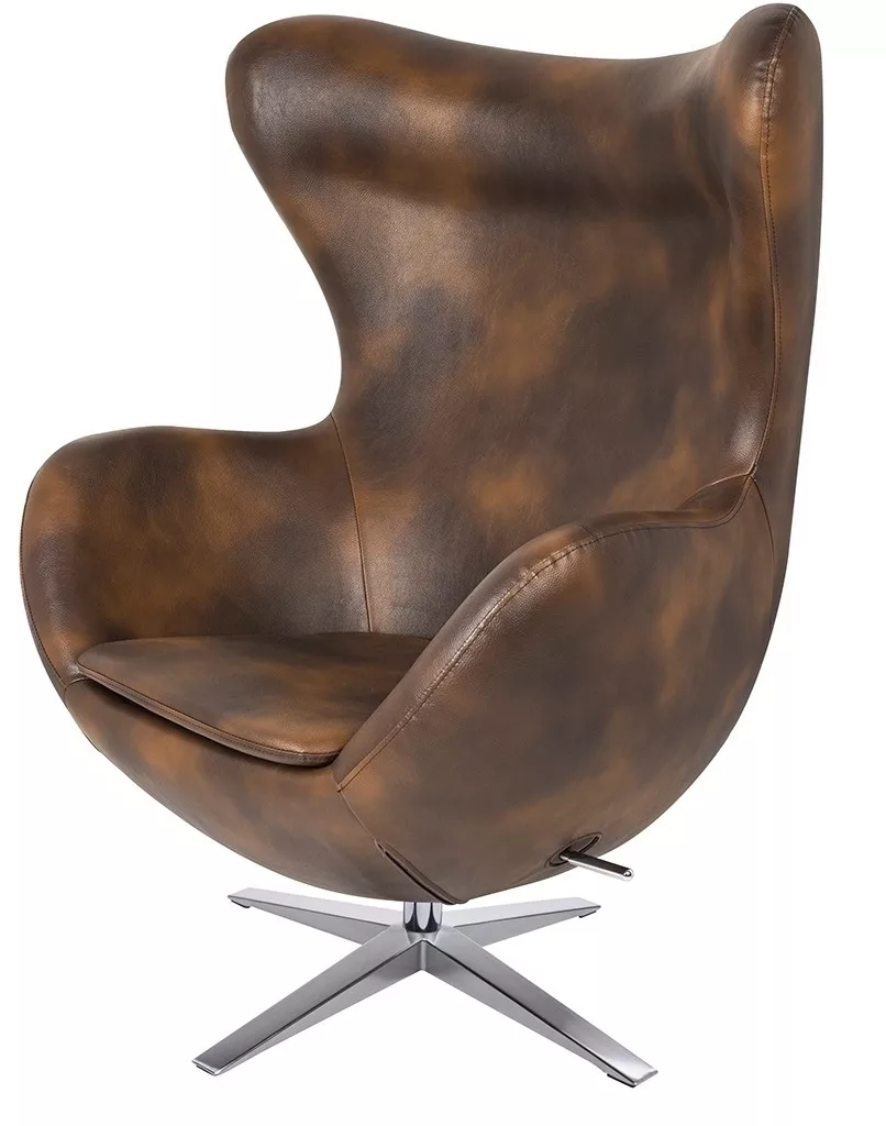 Elegáns és kényelmes Egg forgófotel vintage csokoládébarna műbőr kárpitozással, modern króm lábakkal. A ringató mechanizmussal és állítható döntéssel felszerelt fotel tökéletes választás a stílusos és funkcionális otthoni környezethez.