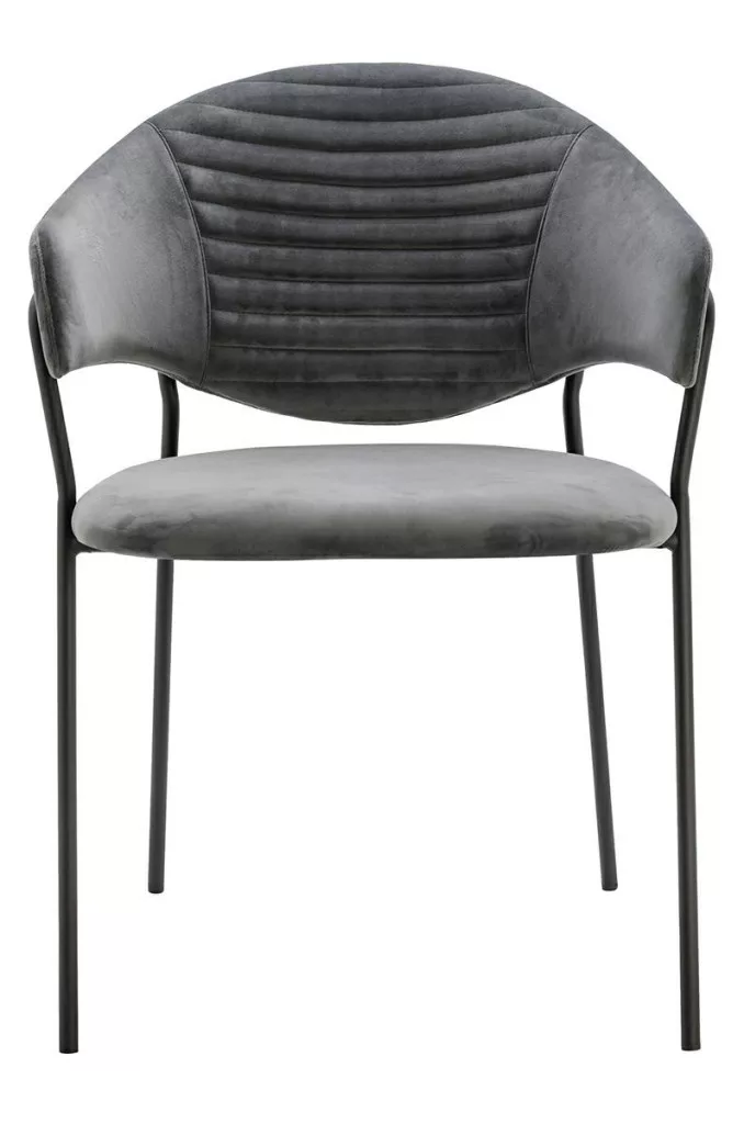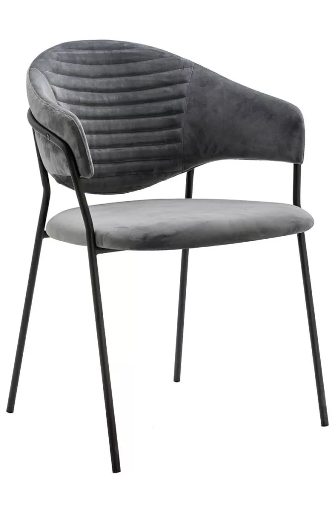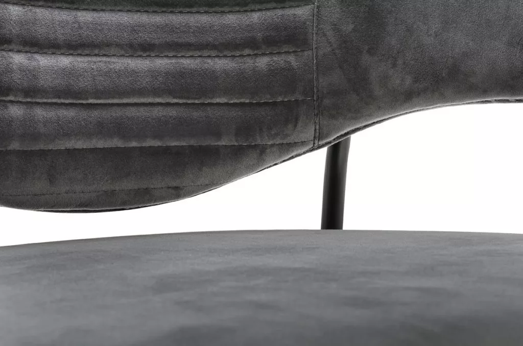 A Naomi szék a modern dizájn és a klasszikus kényelem tökéletes ötvözete. A sötétszürke bársony kárpitozás és a matt fekete fémváz harmonikus összhangot teremt, míg a bordázott háttámla nem csak esztétikai, de ergonómiai szempontból is kiemelkedő. A szék kompakt méretei ellenére tágas ülőfelületet és optimális támasztást biztosít.