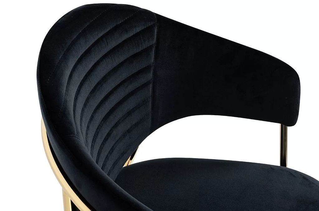 A King Home Naomi szék a modern luxus és a praktikum tökéletes ötvözete. A fekete velúr kárpitozás és az arany színű fémváz elegáns kontrasztot alkotnak, míg a háttámla dekoratív varrása különleges karaktert kölcsönöz a széknek. Az ergonomikus kialakítás és a puha ülőfelület maximális kényelmet biztosít.
