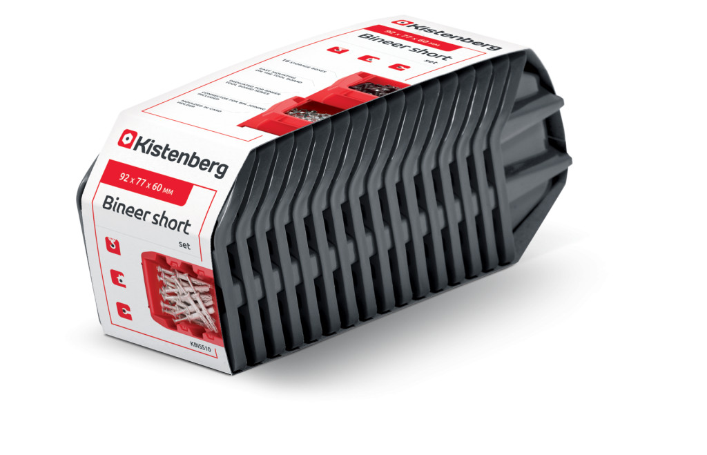 A Kistenberg Bineer Short tároló készlet tökéletes megoldást nyújt a műhelyek és munkaterületek rendszerezéséhez. A 16 darabos készlet különálló tárolóelemei innovatív csatlakozórendszerrel kapcsolhatók össze, így rugalmasan alakítható ki a kívánt tárolórendszer. A tárolók egymásra helyezhetők és falra is szerelhetők a Bineer Board rendszerrel.