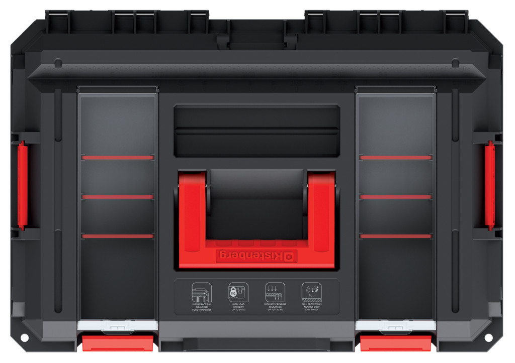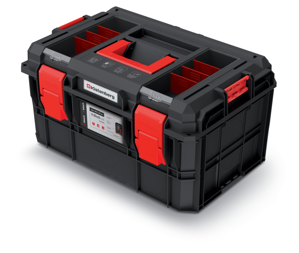 A megerősített polimer ház, a fém zsanérok és a tömített szigetelés IP55 szintű por- és vízvédelmet nyújt. A láda munkaállványként is használható 120 kg teherbírással, és tökéletesen illeszkedik az X Block rendszer többi eleméhez.
