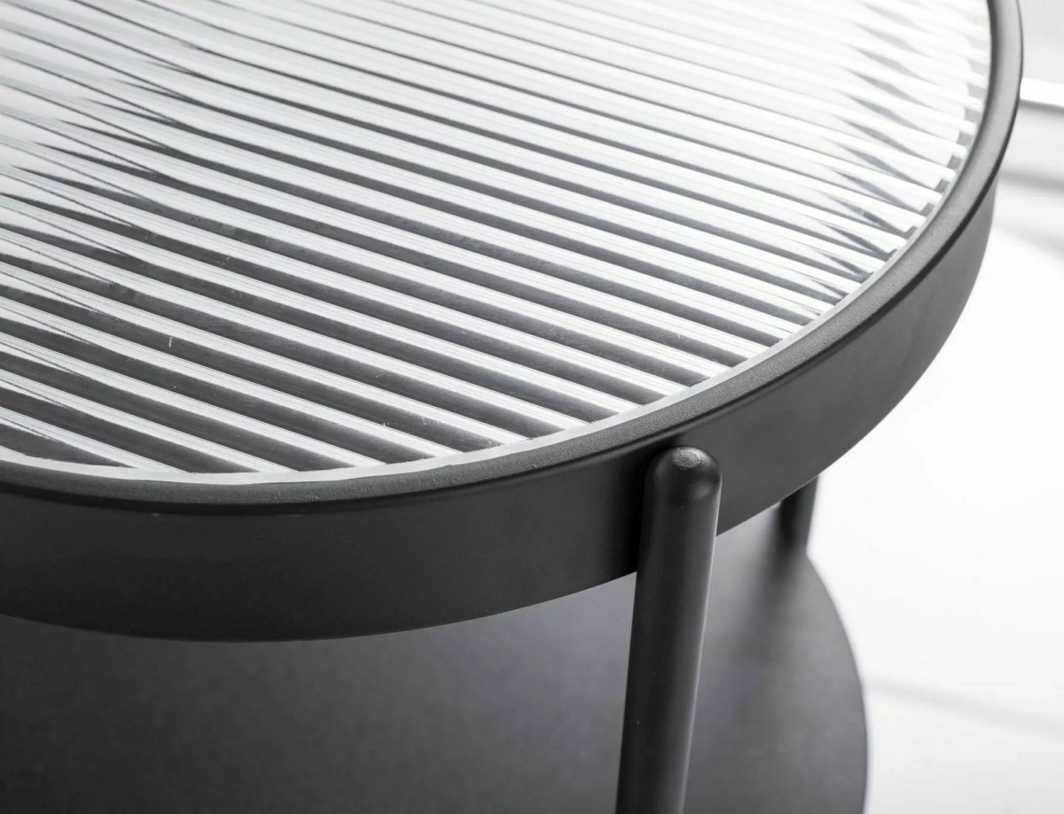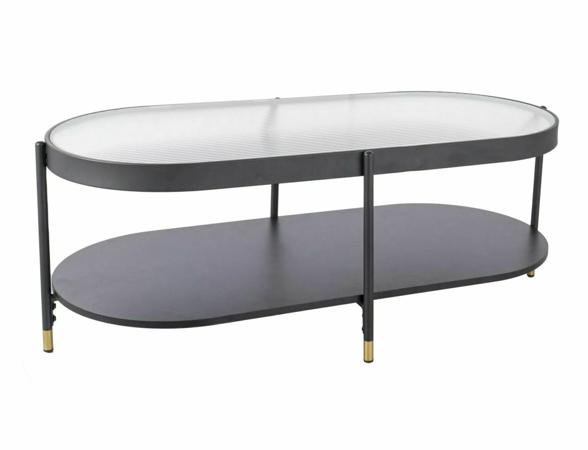 Modern, elegáns dohányzóasztal átlátszó üveg lappal és matt fekete fém vázzal. Praktikus kétszntes kialakításával extra tárolóhelyet biztosít, miközben stílusos kiegészítője lehet bármely nappalinek.